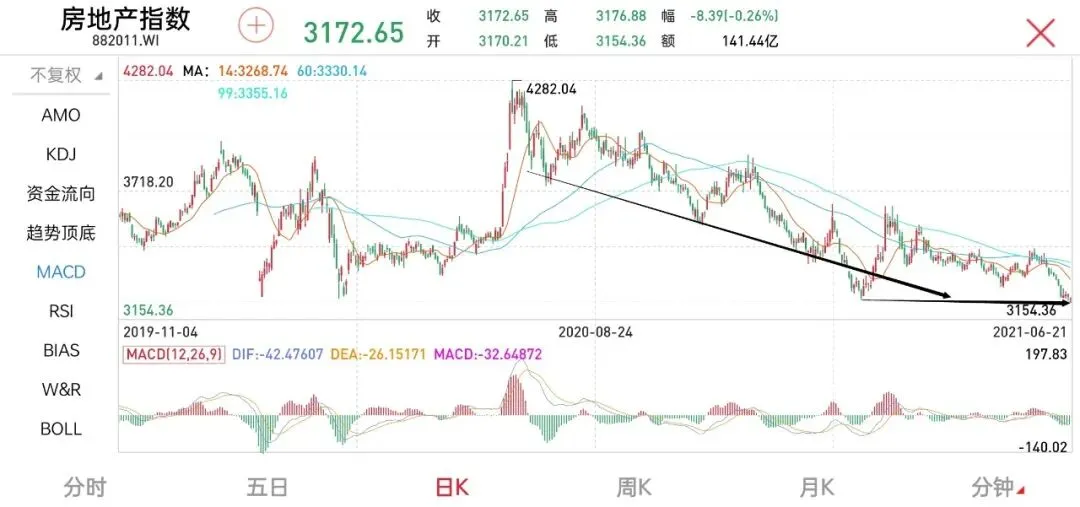 周期行业指数当中,走势最惨的莫过于房地产指数,