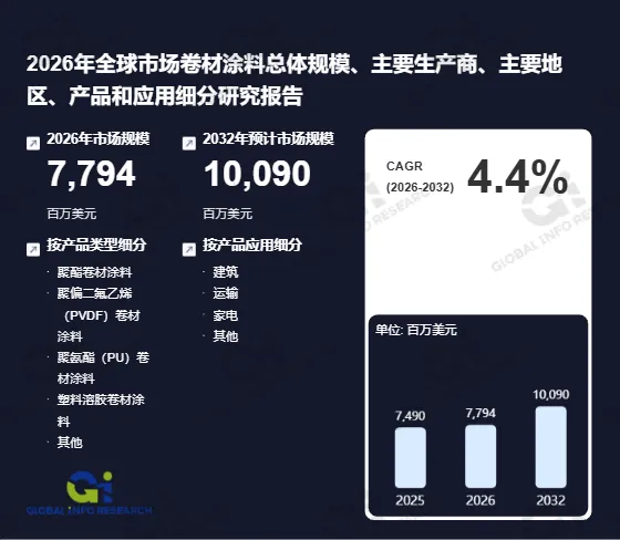 据Global Info Research(GIR)调研数据显示,2025年全球卷材涂料市场收入约为7490百万美元,预计到2032年将增至10090百万美元,在2026至2032年间实现4.4%的年复合增长率(CAGR)。这一稳健增长得益于建筑翻新、绿色家电升级以及交通运输轻量化对高性能预涂金属材料的持续需求。2024年全球卷材涂层产量已达约2975千吨,平均售价约为每吨2351美元,反映出该产品在工业材料中的高附加值属性。