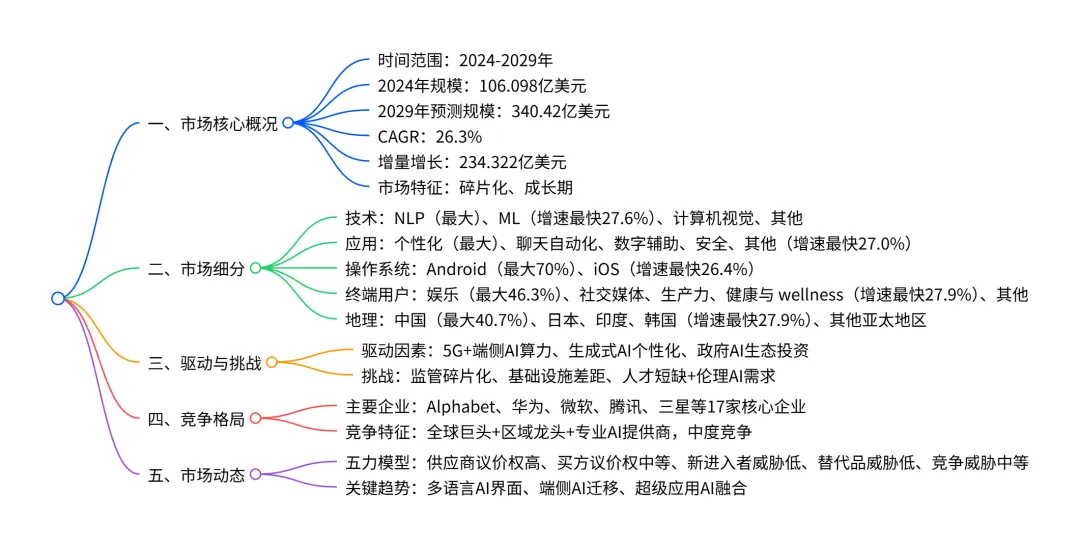 核心企业:共 17 家,包括全球巨头(Alphabet、微软、三星)、区域龙头(华为、腾讯、小米)、专业 AI 提供商(OpenAI、AssemblyAI)。 企业分类:主导型(如 Alphabet、腾讯)、纯 play 型(如华为)、行业聚焦型(如 ELSA Co. Ltd.)。 五力模型结论:供应商议价权高(OS 与云服务商主导)、买方议价权中等(用户切换成本低)、新进入者威胁低(数据与人才壁垒)、替代品威胁低(AI 功能不可替代)、竞争威胁中等(碎片化市场竞争),2024-2029 年市场有利指数维持 0.6。
