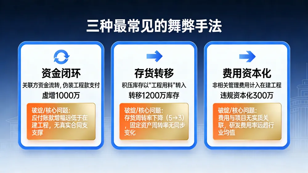 存货转移:某家电企业存货周转率从5降至3,在建工程却增40%,实则将1200万积压库存以“工程用料”转入在建工程。破绽是存货周转率下降但固定资产周转率无同步变化。