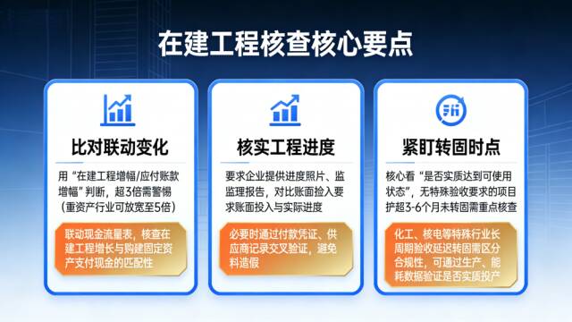 紧盯转固时点:核心看“是否实质达到可使用状态”,无特殊验收要求的项目投产超3-6个月未转固需重点核查;化工、核电等特殊行业长周期验收延迟转固需区分合规性,可通过生产、能耗数据验证是否实质投产。