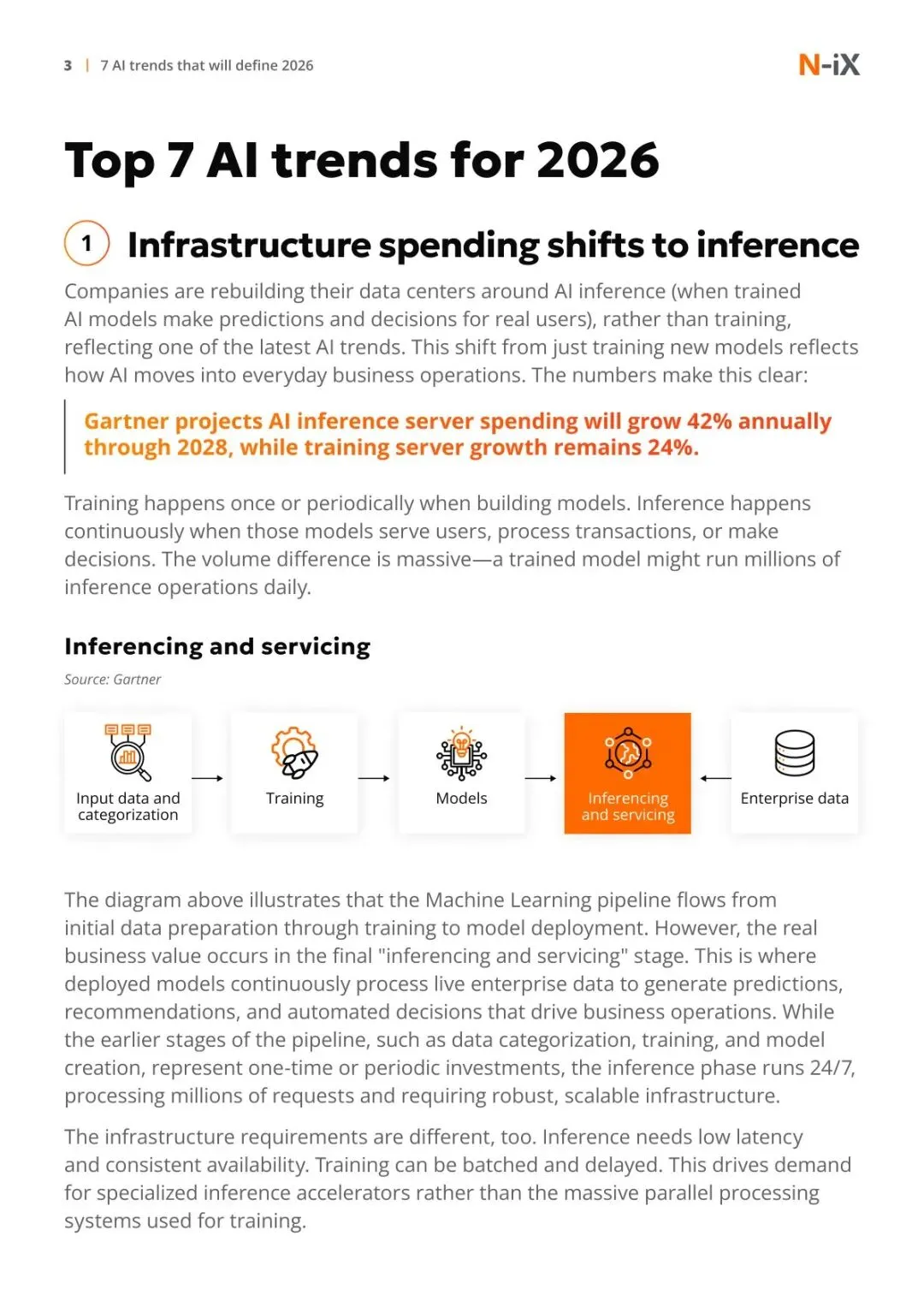 AI 已从测试阶段深度融入各行业核心业务,2026 年将成为标准商业实践,而非可选试点技术。全球 AI 支出持续攀升,企业对 AI 的投入不再局限于模型训练,而是转向支撑日常运营的推理阶段 —— 训练仅为一次性或周期性投入,而推理需 24 小时持续处理海量用户请求、交易与决策,成为创造商业价值的关键环节。这一转变推动数据中心基础设施重构,推理服务器支出年增长率将达 42%,远超训练服务器的 24%,同时对低延迟、高可用性的需求催生了专用推理加速器,而 AI 推理的高功耗也迫使企业升级电力与冷却系统,避免部署瓶颈。