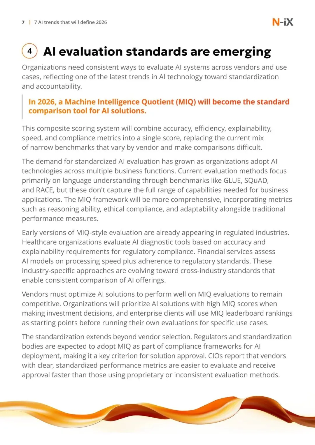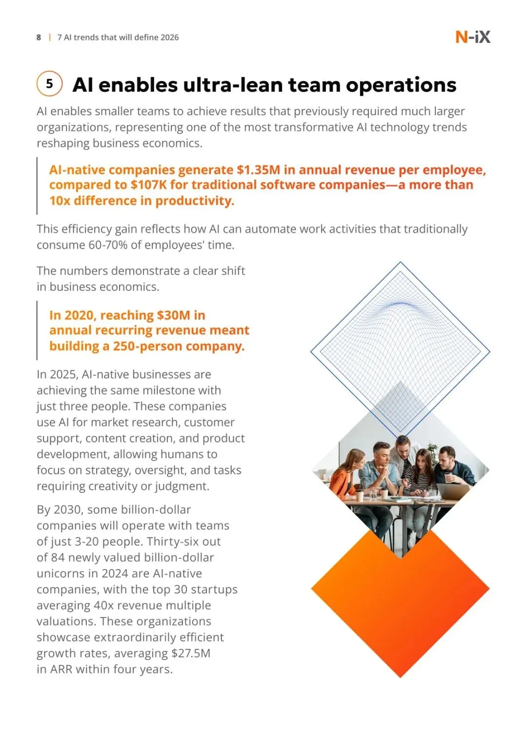 AI 评估标准化与精益团队运营成为新趋势。此前缺乏跨厂商、跨场景的统一评估标准,2026 年机器智能商数(MIQ)将成为行业基准,综合准确性、效率、可解释性等多维度指标,解决当前 benchmarks 零散的问题,且可能被纳入监管合规框架。AI 技术还让小型团队具备强大生产力,AI 原生公司人均年收入是传统软件公司的 10 倍以上,2025 年部分企业仅需 3 人即可实现 3000 万美元年度经常性收入,未来甚至会出现 3-20 人的十亿级公司。这种精益模式通过 AI 自动化市场调研、内容创作等常规工作,将人力集中于战略与创意环节,显著降低运营成本与烧钱速度。