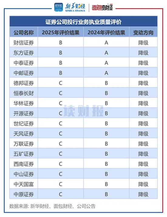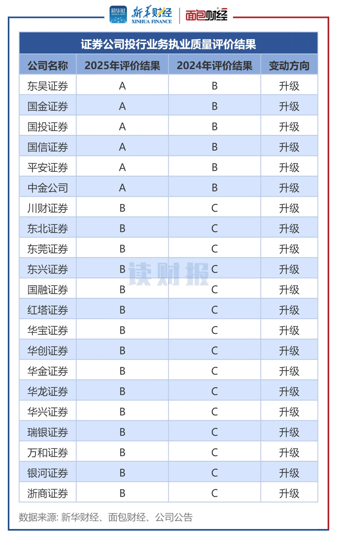 川财证券、东北证券、东莞证券、东兴证券、国融证券、红塔证券、华宝证券、华创证券、华金证券、华龙证券、瑞银证券、万和证券、银河证券、浙商证券的2025年的投行业务的质量评价由C类升至B类。