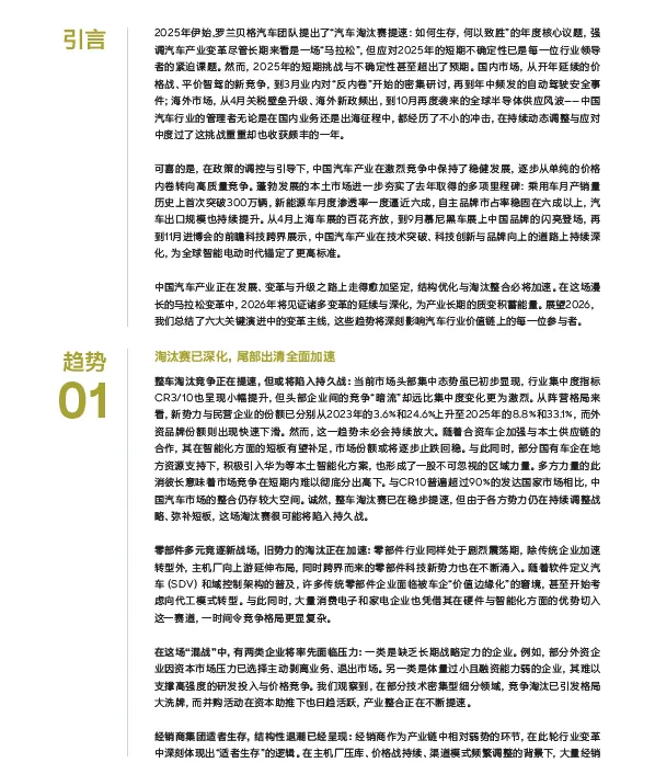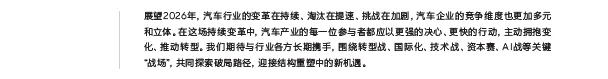 展望2026年,汽车产业的变革将持续深化,淘汰赛、转型战、技术战、AI战等多战场叠加,推动行业向高质量发展转型。罗兰贝格指出,中国汽车市场作为全球创新中心的地位将进一步巩固,企业需要以更强的决心和更快的行动主动拥抱变革,把握机遇,实现可持续发展。