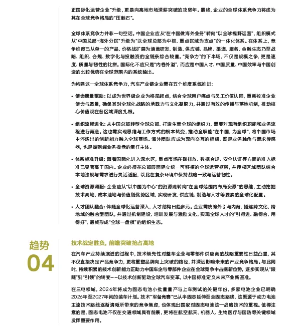 第三个趋势是“国际化深入”。在国际化方面,罗兰贝格指出,随着“低垂果实”逐渐被摘尽以及地缘政治摩擦加剧,国际市场的竞争逻辑已经从“产品出海”迈向“全价值链体系输出”。2026年作为关键的转型之年,罗兰贝格建议,头部企业需完成从“出海型企业”到“国际化运营企业”的蜕变。企业需从组织架构、标准体系、资源调配、人才融合等多维度发力,构建“全球总部中枢+区域支点”的运营模式,将中国效率与创新能力转化为全球竞争优势。