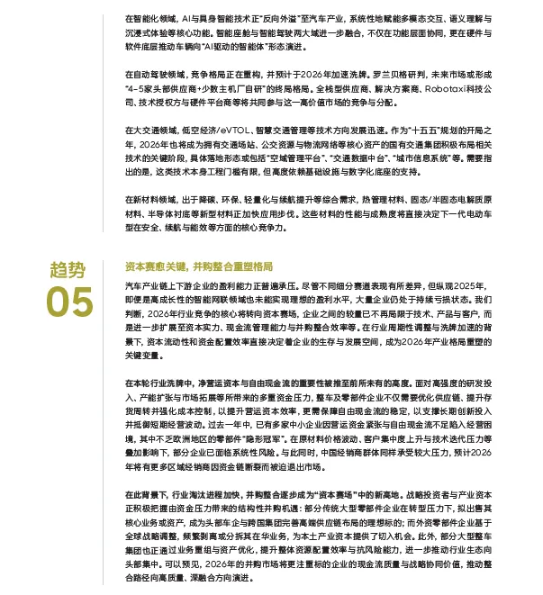 第四个趋势是“技术战决胜”。罗兰贝格认为,技术创新成为决定产业格局的核心变量,中国企业正从技术跟随转向引领。在三电领域,2026年将迎来固态电池小批量量产与上车测试的关键节点,技术竞赛已从半固态延伸至全固态路线。在智能化领域,AI与具身智能技术反向赋能汽车产业,推动人机交互功能的体验升级;智能座舱与智能驾驶两大域的深度融合,驱动车辆向“AI驱动的智能体”演进。自动驾驶领域将加速洗牌,罗兰贝格研判,未来市场或形成“4-5家头部供应商+少数主机厂自研”的终局格局,同时低空经济、智慧交通与新材料技术的突破,也将为产业开辟新的增长曲线。