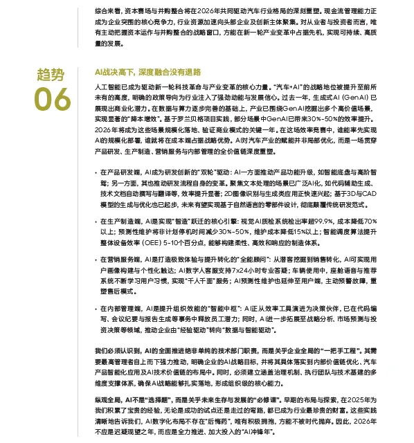 第五个趋势是“AI战突围”。罗兰贝格指出“AI不是‘选择题’,而是关乎未来生存与发展的‘必修课’”,并且AI对汽车产业的赋能并非局部优化,而是一场贯穿产品研发、生产制造、营销服务与内部管理的全价值链深度重塑。在过去一年中,生成式AI(GenAI)已展现出商业化潜力,在罗兰贝格项目实践的部分场景中提升了30%—50%的效率,2026年将成为这些场景规模化落地、验证商业模式的关键一年。谁能率先实现AI的规模化部署,谁就将在成本端占据战略优势。