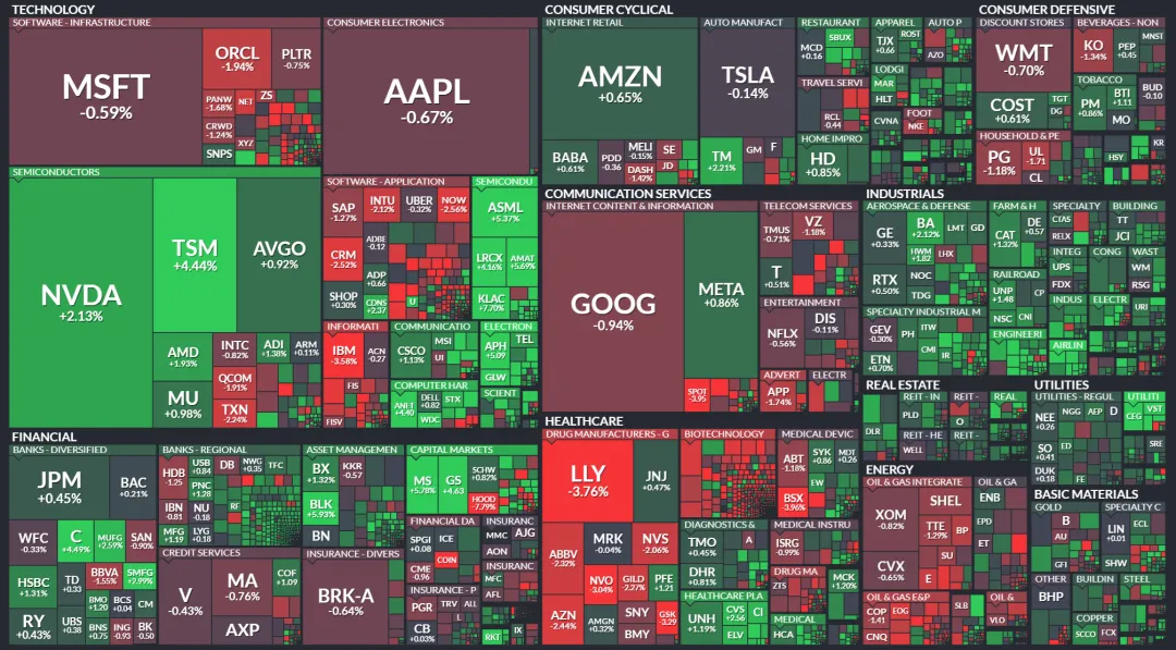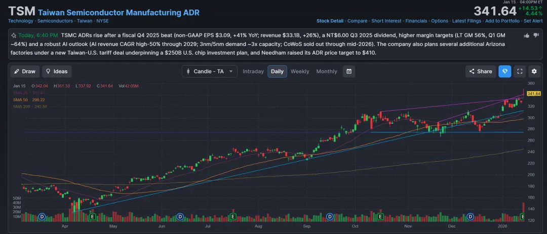 1. 台积电(TSM)收高4.44%。台积电披露2025年第四季度业绩,公司2025年第四季度净利润飙升35%,达到约160亿美元,创历史新高,远超市场预期,并连续第七个季度实现两位数增长。其中,3nm制程的销售额占晶圆销售额比例达到28%,5nm制程占35%,7nm制程占比14%,合计占比达到77%。