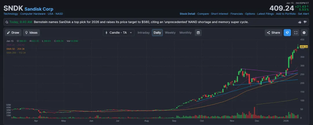 2.闪迪(SNDK)收高5.53%,股价创历史新高。有投行将闪迪的目标股价从300美元大幅上调至580美元,维持“跑赢大盘”评级。有分析师及其团队指出,AI驱动的数据爆炸正在创造一个“前所未有的存储超级周期”。
