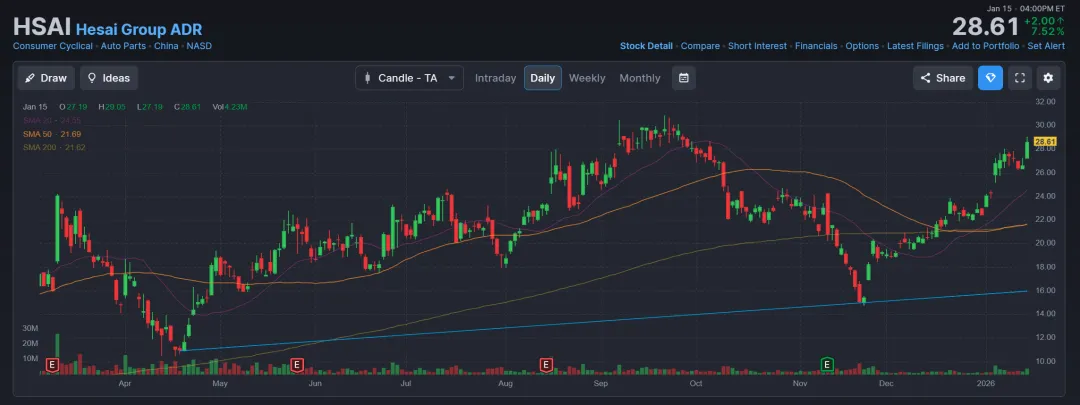 5. 禾赛(HSAI)涨逾5%。消息面上,随着车辆自动驾驶能力不断演进,相关产业链近年来也持续保持较高增速。其中,用于测距的激光雷达作为关键硬件之一,出货量不断走高。市场普遍认为,2026年有望成为自动驾驶从“技术验证阶段”迈向“更大范围商业化应用”的重要节点,相关产业链零部件厂商有望迎来增长机会。