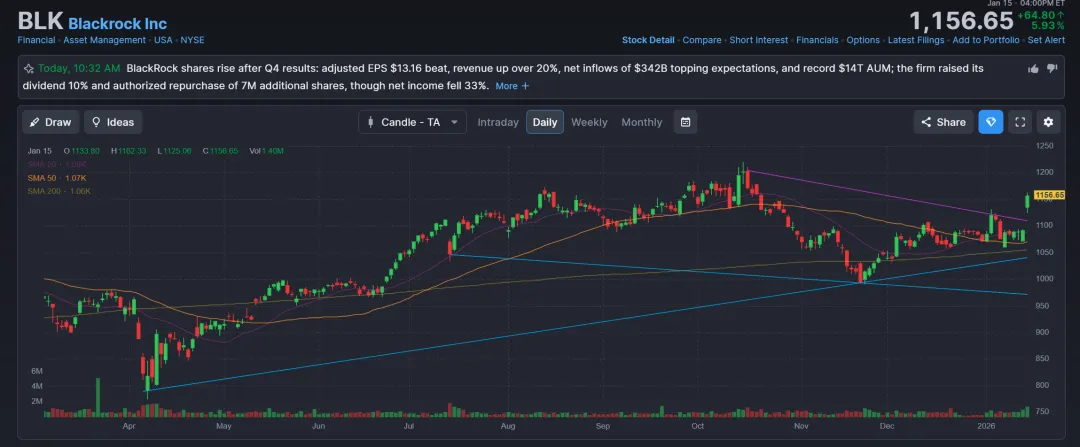 6. 贝莱德(BLK)涨逾4%。财报显示,贝莱德第四季度营收同比上升23%,至70亿美元,超出分析师67亿美元的平均预期;调整后每股收益同比增长10%,达到13.16美元,超出分析师12.28美元的平均预期。贝莱德在2025年第四季度从客户处吸引了合计3420亿美元的资金流入,资产管理规模(AUM)升至创纪录的14万亿美元。