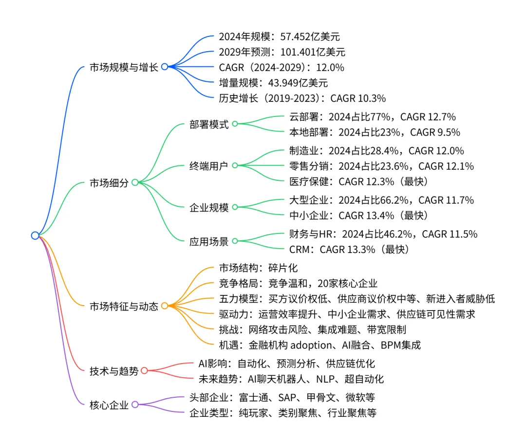市场结构:呈碎片化特征,2024 年市场有利指数为 0.7,2029 年保持不变,市场动态稳定。 五力模型分析(2024-2029 无变化): 买方议价权:低(产品差异化高,部分大企业有少量议价能力) 供应商议价权:中等(供应商集中度低,产品差异化中等) 新进入者威胁:低(规模经济、产品差异化构成高壁垒) 替代品威胁:中等(独立解决方案为潜在替代,客户转换意愿温和) 竞争威胁:中等(企业数量多但市场增长快,竞争相对温和) 核心企业:共覆盖 20 家企业,包括富士通、SAP、甲骨文、微软、华为、金蝶、用友等,分为主导型、纯玩家、类别聚焦、行业聚焦、多元化五类,头部企业包括富士通、SAP、甲骨文(排名 1 级)。