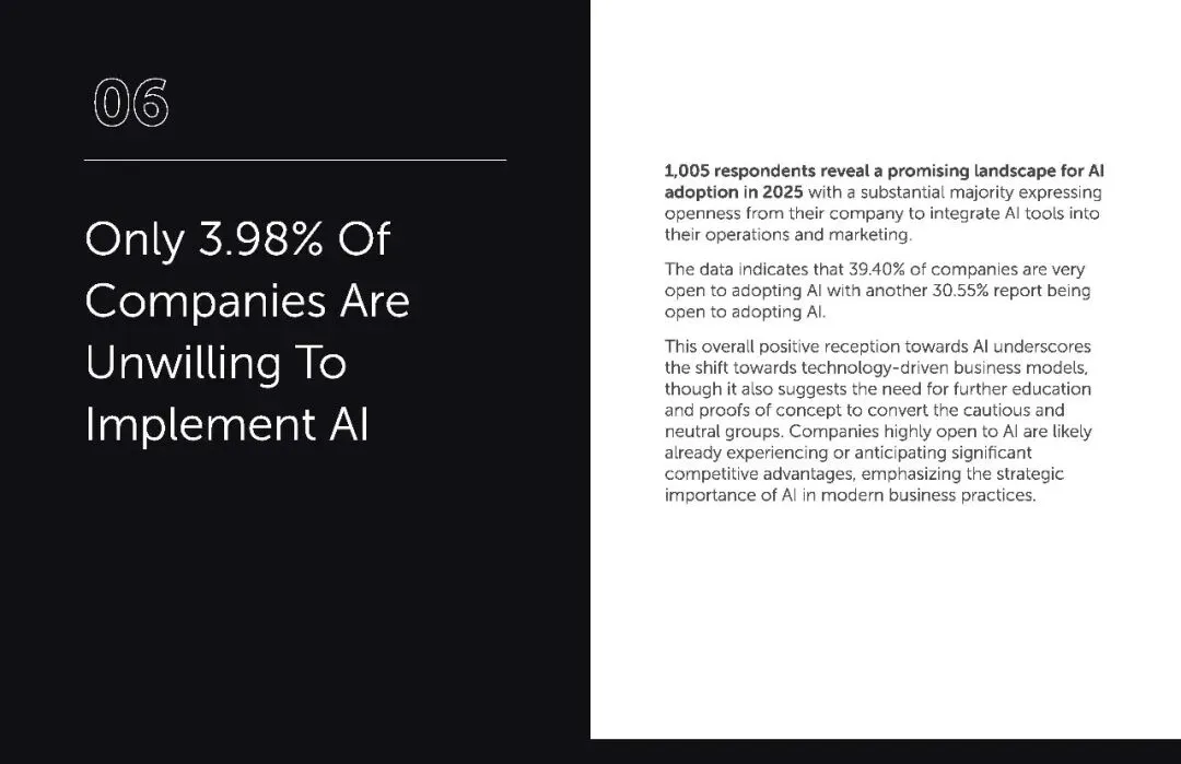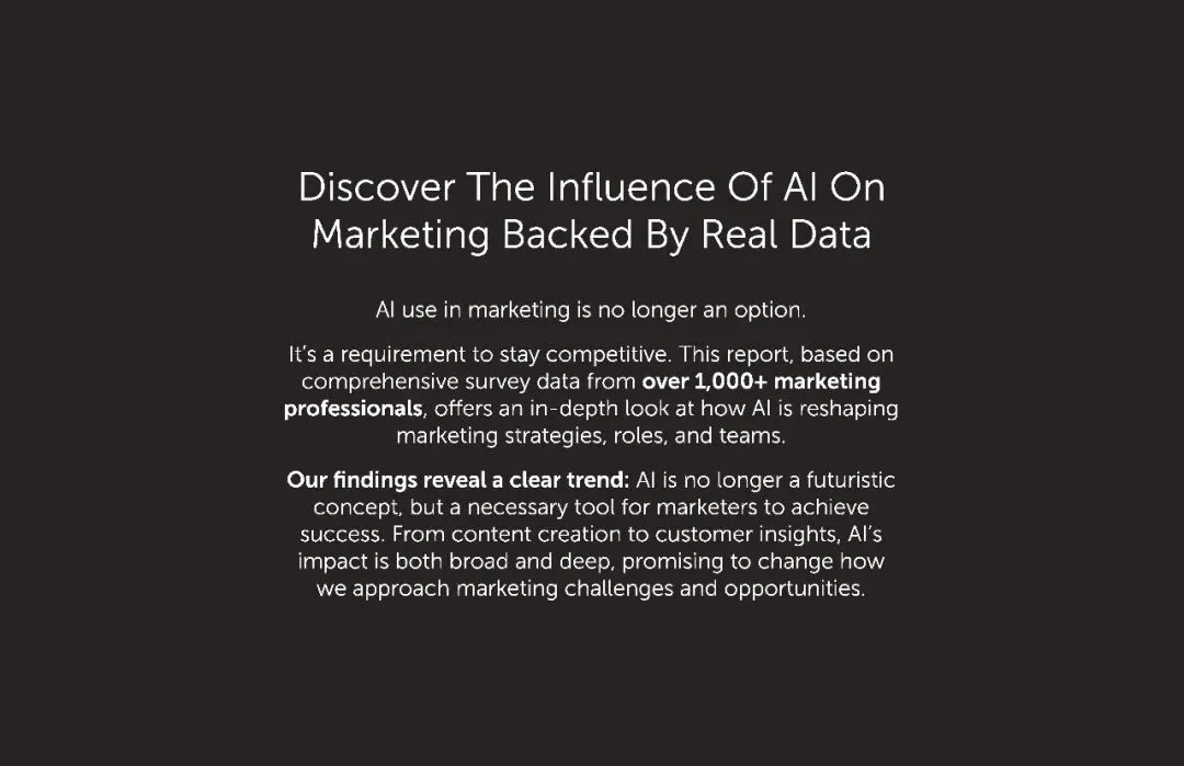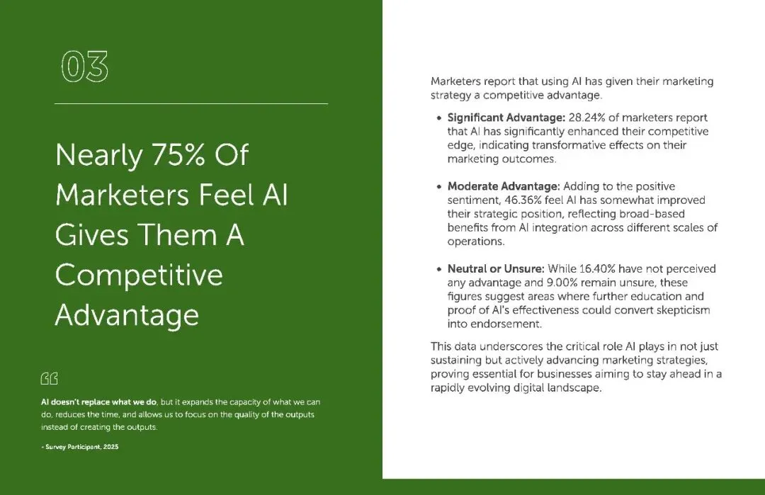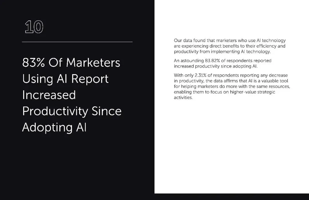 将近 75% 的营销人感受到了 AI 带来的竞争优势,其中 28.24% 认为优势 “十分显著”,46.36% 觉得 “有所提升”。AI 不会取代我们的工作,但它能拓展我们的能力边界,减少重复劳动,让我们专注于提升输出质量。”这正是 AI 的价值所在,把营销人从繁琐的排版、初稿撰写、数据整理中解放出来,投身到策略规划、创意打磨等更高价值的工作中。在数字化竞争白热化的今天,这种效率与质量的双重提升,就是最直接的竞争力。