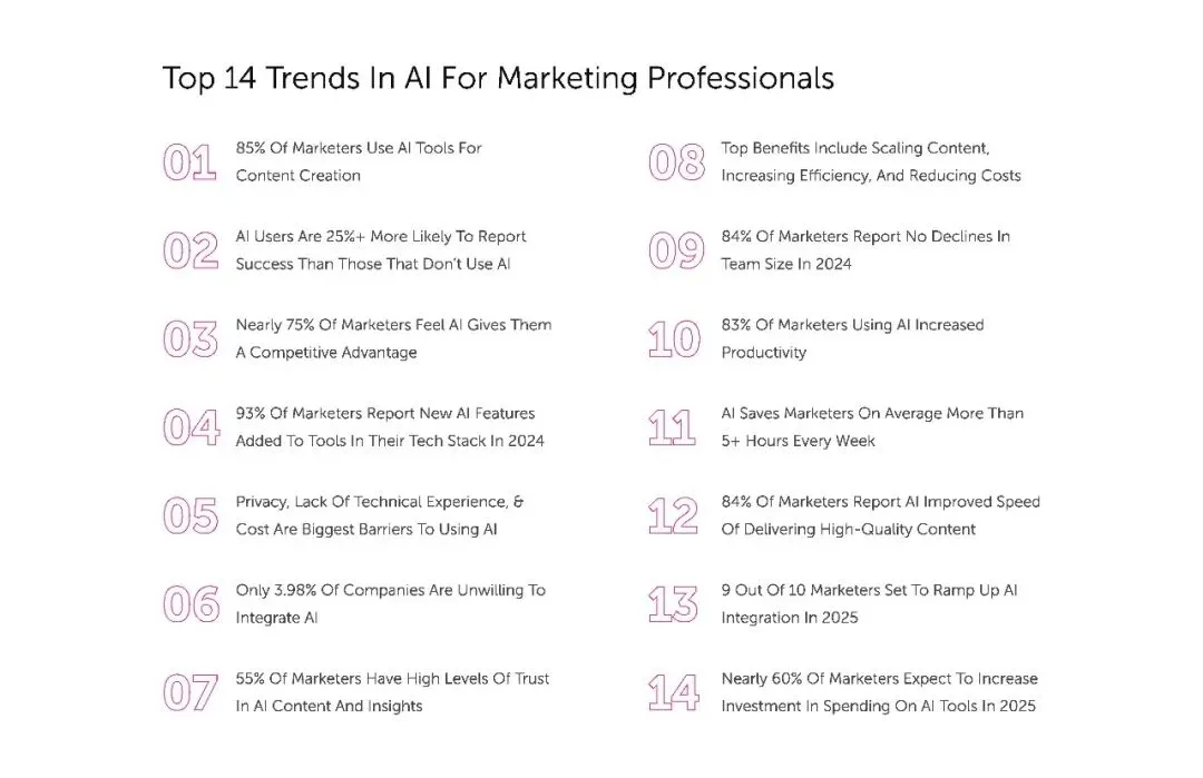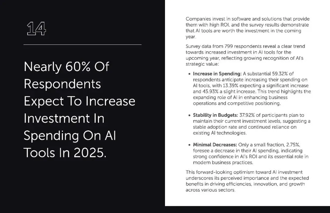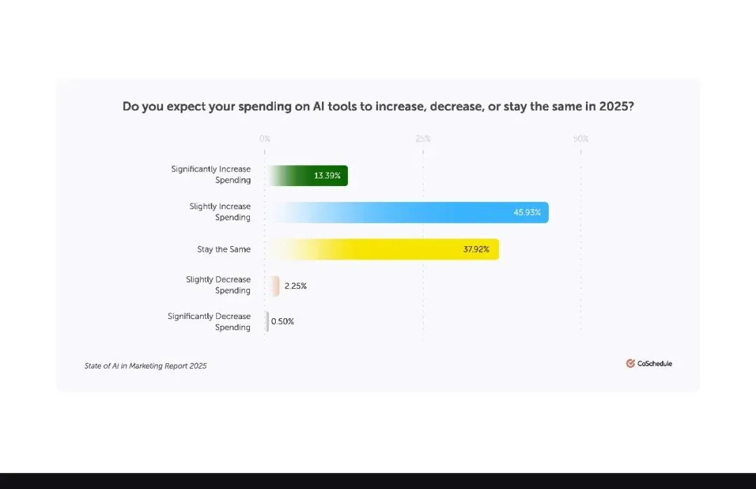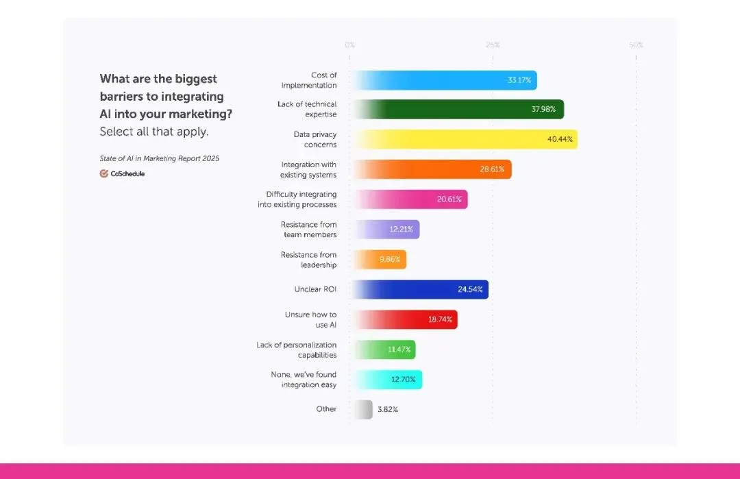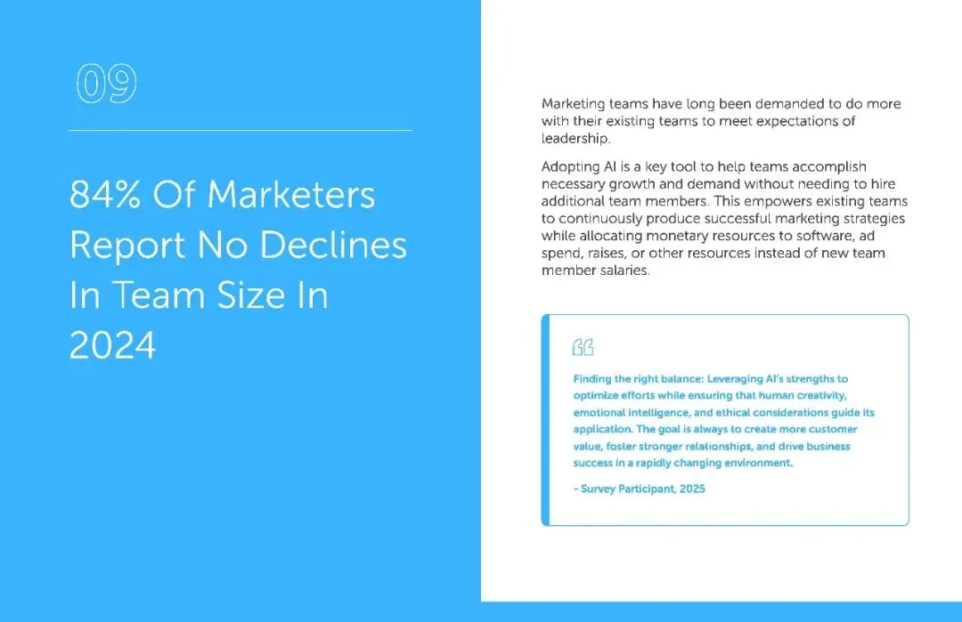 而且AI 并没有引发营销人的 “失业焦虑”。调研显示,2024 年,84% 的营销团队规模没有缩减,其中 66.5% 保持不变,15.1% 略有增长。这说明 AI 的作用是 “赋能” 而非 “替代”,它帮助现有团队完成更多工作,无需额外招聘就能应对业务增长。企业可以将原本用于招聘的资金,投入到软件升级、广告投放或员工福利上,形成良性循环。毕竟,营销的核心是人与人的连接,AI 负责高效执行,人类专注创意与情感共鸣,这种分工让团队更具战斗力。