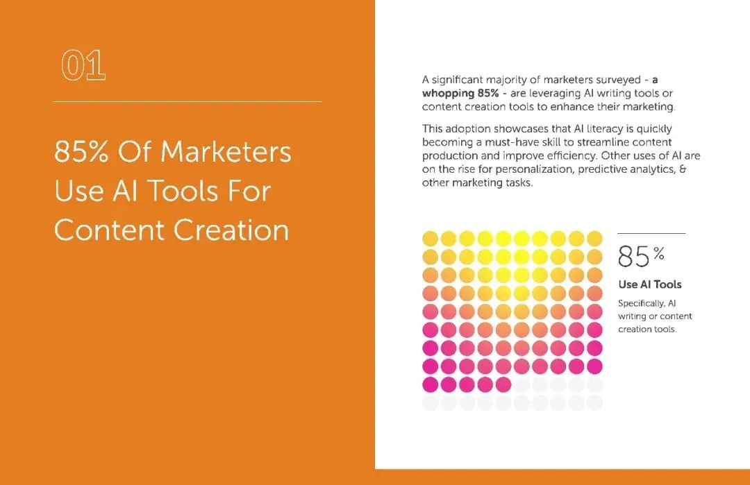 调研显示,85% 的营销人正在使用 AI 写作或内容创作工具。从文案撰写到图片、视频生成,AI 正在成为内容生产的利器。要知道,在个性化引擎、SEO 优化等其他 AI 应用场景中,使用率最高的也不过 51.77%,内容创作成为 AI 渗透最深的领域。毕竟在信息爆炸的时代,谁能更快产出优质内容,谁就掌握了流量密码。