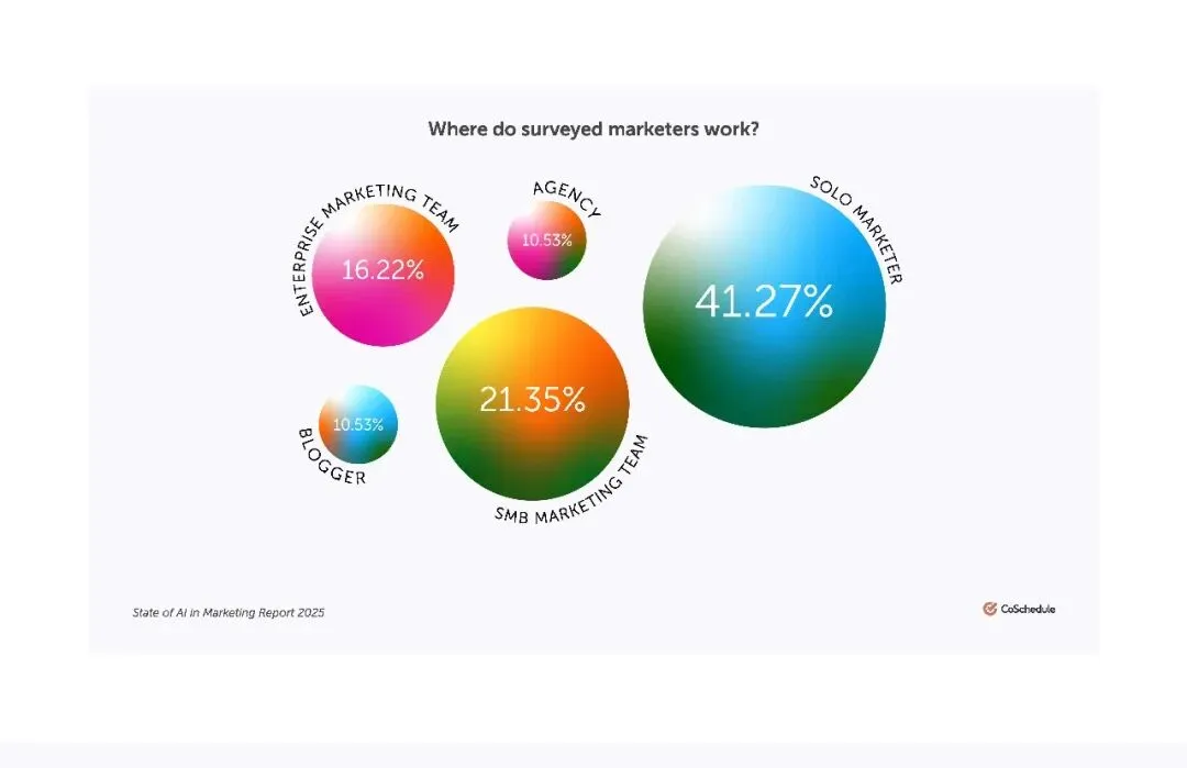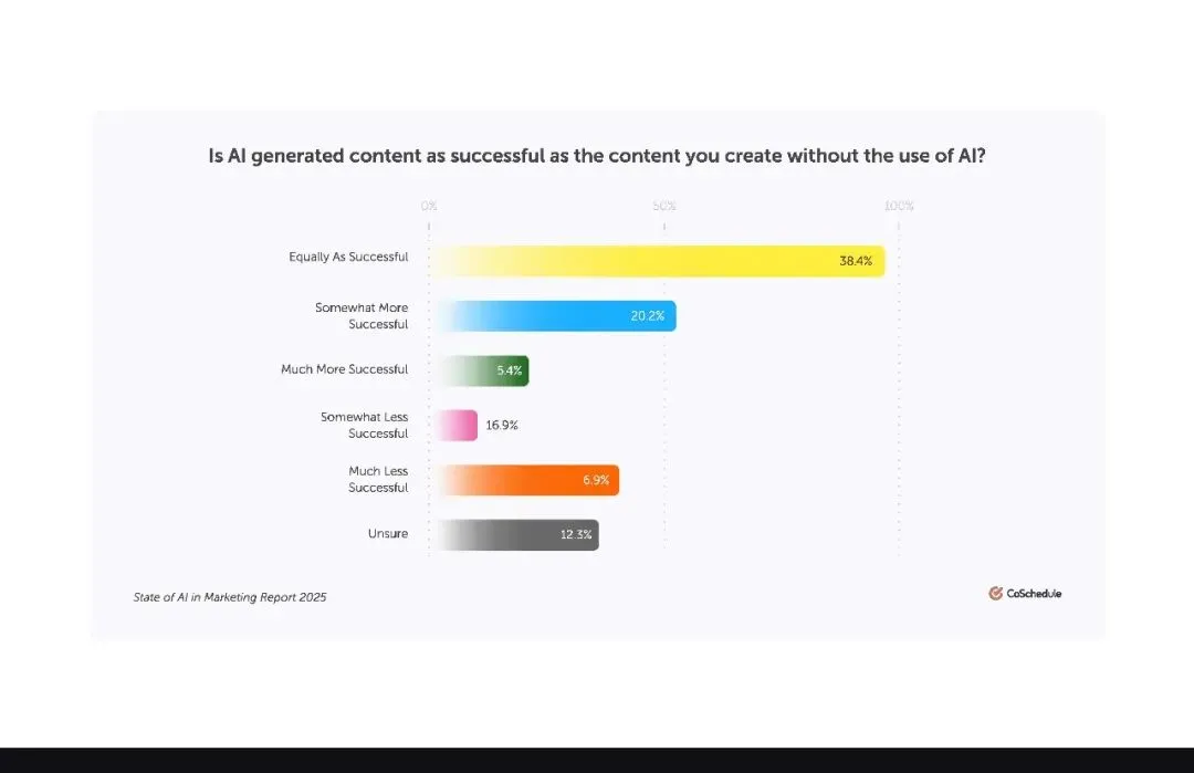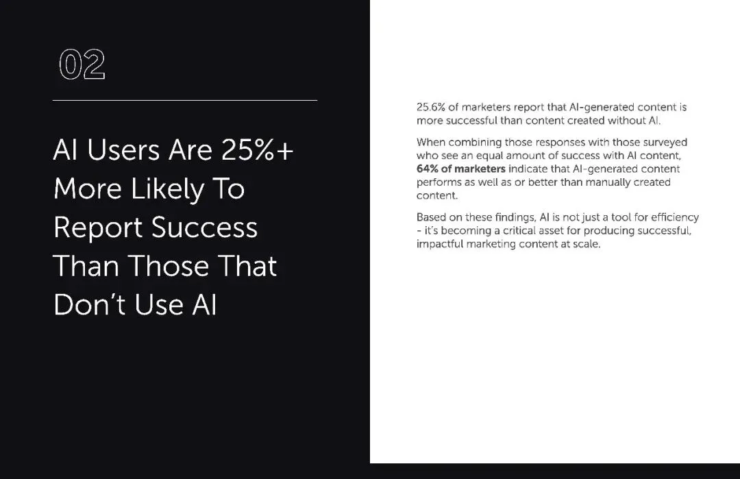AI 带来的不只是 “量” 的提升,更是 “质” 的飞跃。25.6% 的营销人明确表示 AI 生成内容比人工创作更成功,加上 38.4% 认为两者效果相当的受访者,合计 64% 的营销人认可 AI 内容的竞争力。这打破了 “AI 内容缺乏灵魂” 的偏见,事实证明,经过优化的 AI 内容既能契合用户需求,又能节省大量时间成本。更关键的是,使用 AI 的营销人比不使用者成功概率高出 25% 以上,AI 早已不是可有可无的辅助,而是决胜市场的关键资产。