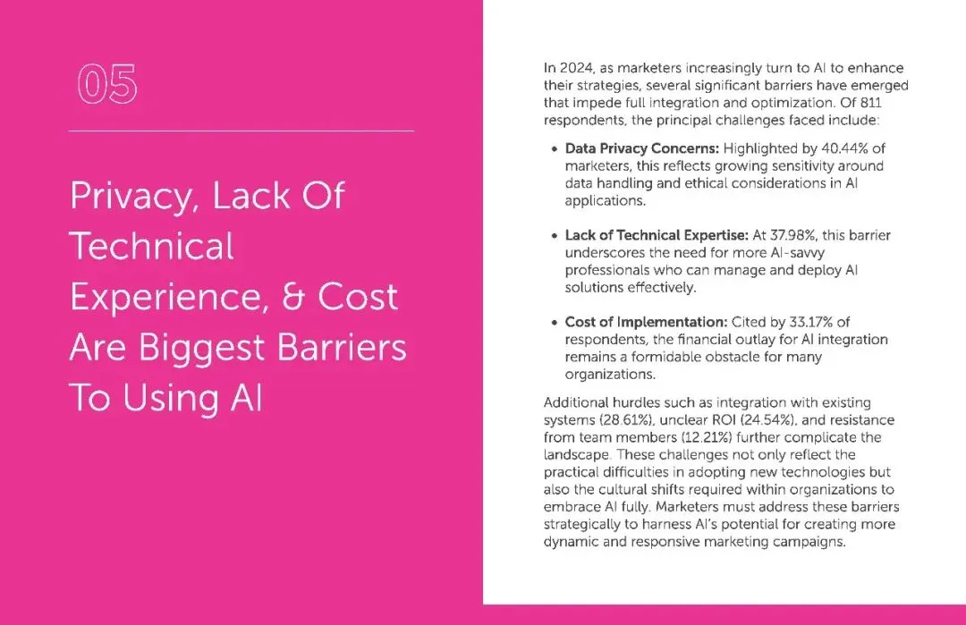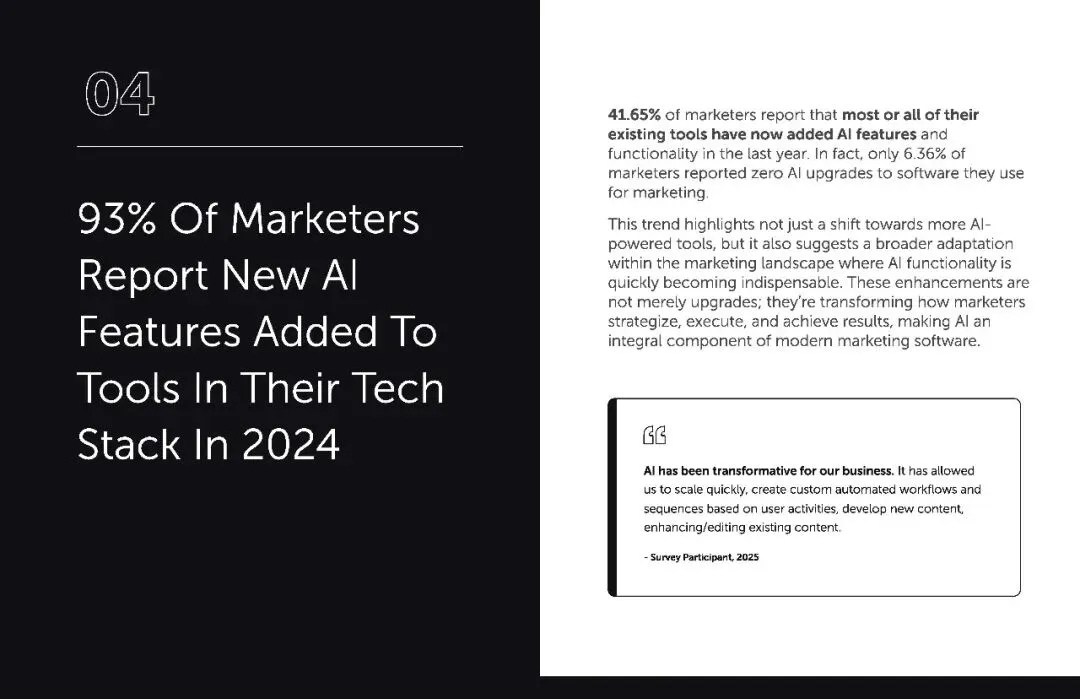 从企业态度来看,AI 普及已是大势所趋。仅有 3.98% 的公司不愿整合 AI,39.4% 的公司 “非常愿意”,30.55%“愿意”。3% 的营销人都发现,2024 年自己使用的营销工具中新增了 AI 功能,其中 41.65% 表示大部分或全部工具都完成了 AI 升级。AI 功能正在成为营销软件的 “标配”,不拥抱变化的企业,注定会被市场淘汰。