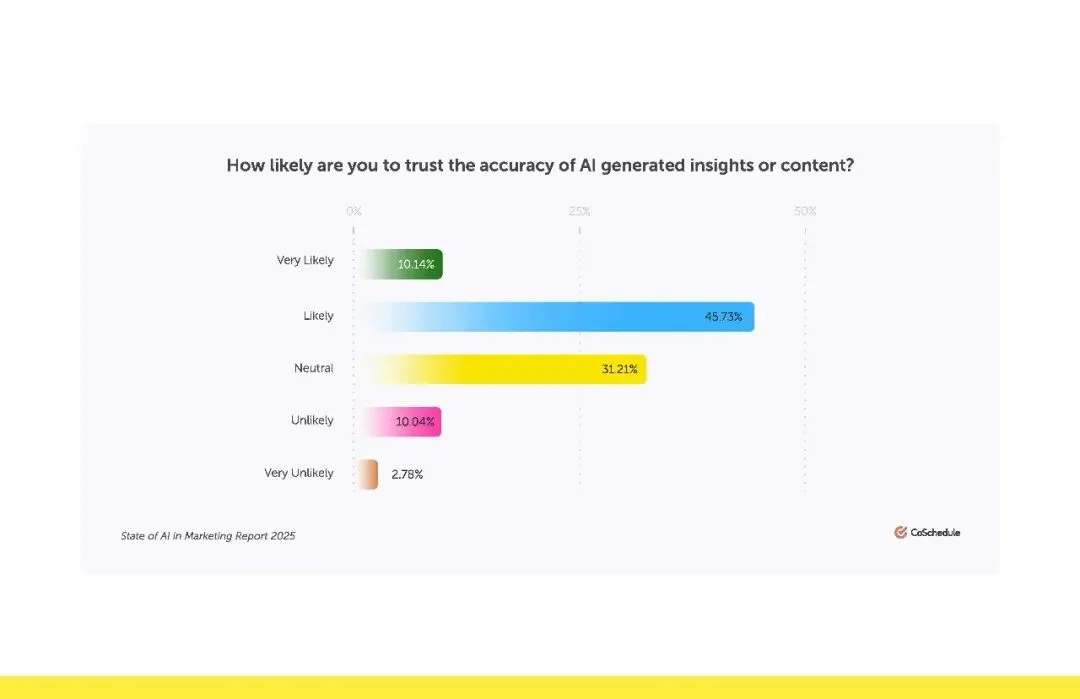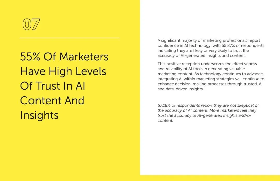 更重要的是,营销人对 AI 的信任度持续攀升。55.87% 的营销人 “可能” 或 “非常可能” 信任 AI 生成的内容和洞察,87.18% 的人并不怀疑 AI 内容的准确性。这种信任并非盲目,而是源于实实在在的效果,AI 不仅能提高效率、降低成本,还能通过数据分析提供精准的客户洞察,帮助营销人做出更明智的决策。