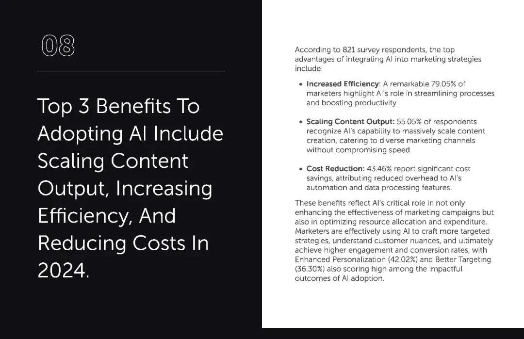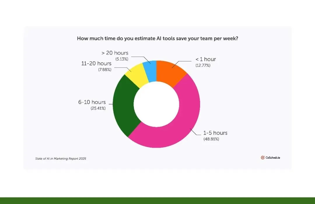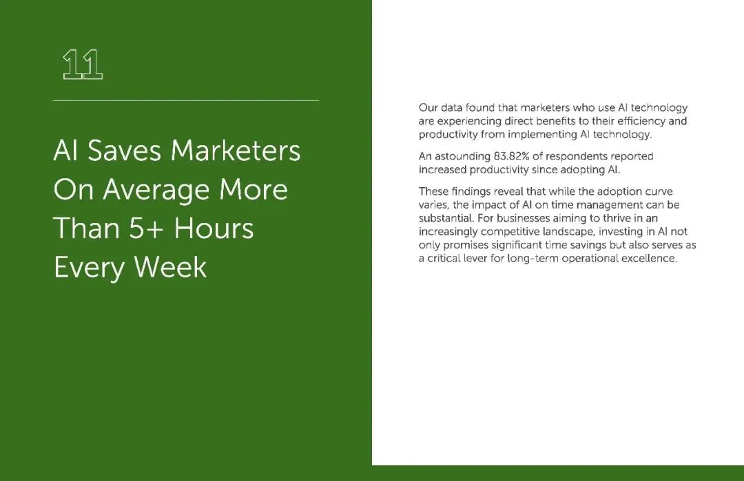 效率提升从来不是空谈。调研显示,83% 的 AI 使用者表示效率显著提高。更直观的是时间节省:AI 平均每周能为营销人节省 5 小时以上。这些时间,足以让营销人深耕客户需求、打磨创意,或学习新的营销技能。