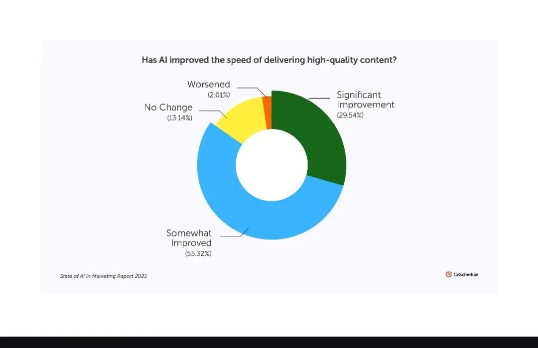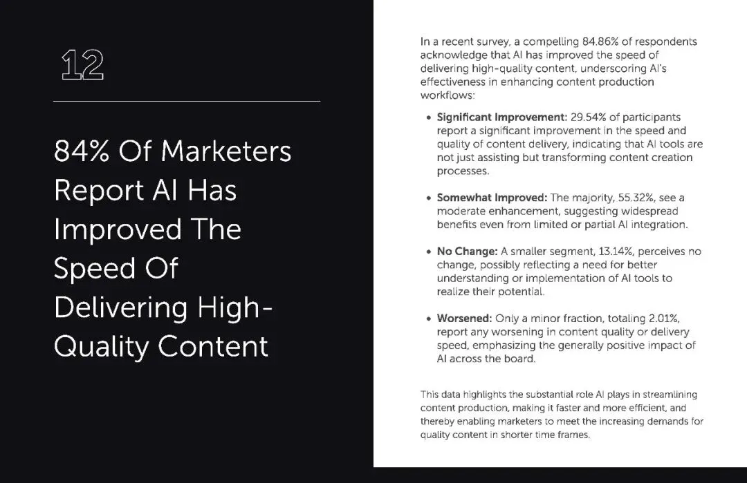 AI 还彻底改变了内容交付的速度与质量。84.86% 的营销人反馈,AI 让高质量内容的交付速度显著提升,29.54% 感受到 “大幅改善”,55.32% 认为 “有所改善”,仅有 2.01% 觉得情况变差。在 “内容为王” 的时代,既要快又要好,AI 完美解决了这个矛盾。它不仅能快速生成初稿,还能通过优化工具提升内容质感,让营销人在应对突发营销节点、批量产出多平台内容时游刃有余。