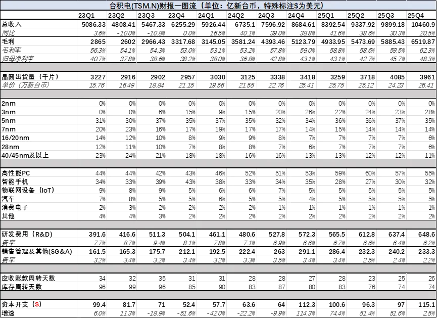3nm制程的周期节奏明显被打乱,毛利率一路向上,在2nm出货的前夕,依然看不到3nm需求下降的趋势,毛利率也是再次站上了62.3%的高位。