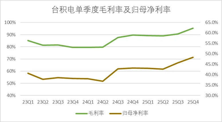 美东时间15日,台积电公布了2025年第四季度的财务报告,录得总营收1.05万亿新台币,明显高于分析师预期的1.02万亿新台币,毛利率达到了62.3%,大幅高于预估60.6%,归母净利润录得5,057亿新台币,同样明显高于分析师预测的4752亿新台币。