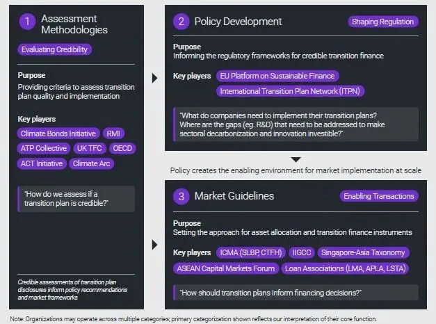 政策发展:为转型融资提供监管框架。常见市场参与者包括欧盟可持续金融平台、国际转型计划网络等;