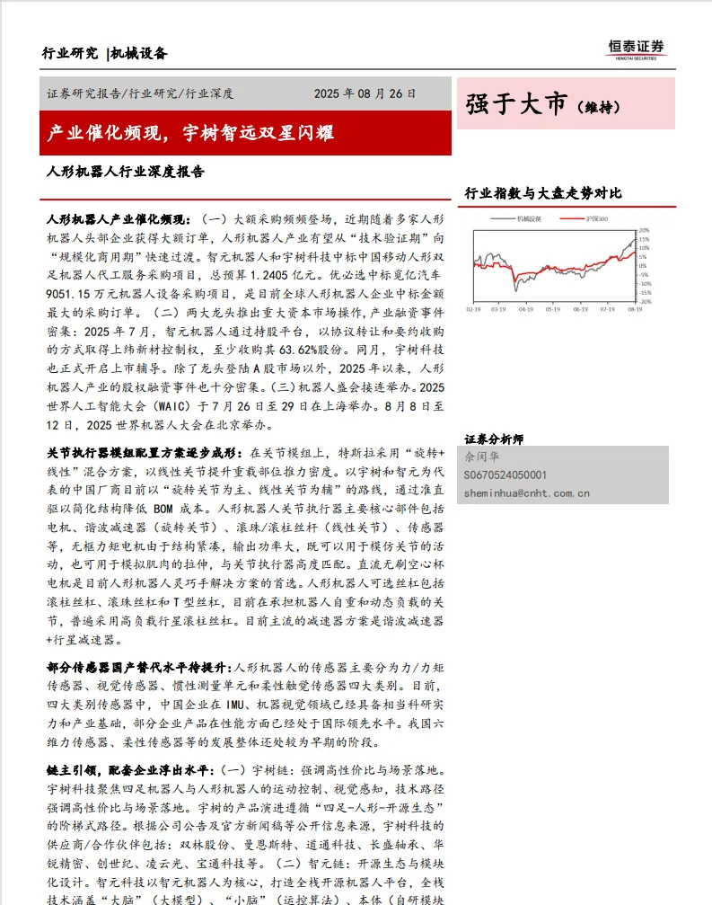 人形机器人作为人工智能与机器人技术的深度融合产物,正逐渐从科幻走向现实。近年来,随着技术的不断突破和市场需求的增长,人形机器人产业迎来了快速发展的契机。本文基于恒泰证券发布的《人形机器人行业深度报告:产业催化频现,宇树智远双星闪耀》,深入剖析人形机器人产业的发展现状、核心零部件配置、传感器技术进展、产业链生态以及未来发展趋势,旨在为相关从业者、投资者以及政策制定者提供全面且深入的参考。