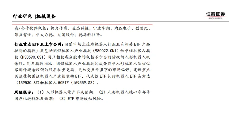 目前市场上追踪机器人行业且有相关ETF产品挂钩的指数主要包括国证机器人产业指数(980022.CNI)和中证机器人指数(H30590.CSI)。国证机器人产业指数的成分股中人形机器人及核心零部件概念较强的股票权重更高,更加受益于当下的市场偏好。建议重点关注挂钩国证机器人产业指数的ETF,代表性ETF包括机器人ETF易方达(159530.SZ)和机器人50ETF(159559.SZ)。此外,多家上市公司在人形机器人领域具有较强的竞争力,例如三花智控、拓普集团、绿的谐波、中大力德、斯菱股份、恒立液压、北特科技、贝斯特、五洲新春、双林股份、长盛轴承、步科股份、雷赛智能、卧龙电驱、曼恩斯特、奥比中光、天准科技、柯力传感、安培龙、汉威科技、福莱新材、华辰装备、秦川机床、华锐精密等。