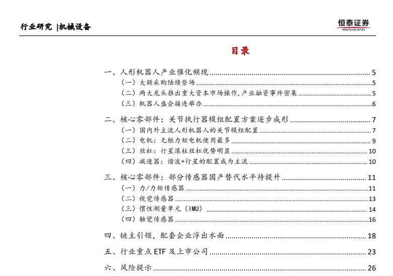 人形机器人产业正处于快速发展的关键时期,大额采购订单的涌现、资本市场的密集动作以及机器人盛会的接连举办,为人形机器人产业的发展注入了强大动力。核心零部件配置方案的逐步成形、传感器技术的不断进步以及产业链生态的不断完善,为人形机器人产业的未来发展奠定了坚实基础。然而,人形机器人量产不及预期、核心零部件国产化进程不及预期以及ETF市场波动风险等挑战仍需关注。未来,随着技术的不断突破和市场的逐步成熟,人形机器人有望在更多领域实现广泛应用,为人类社会的发展带来新的机遇和挑战。