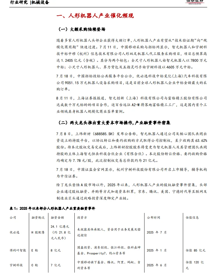 2025年,人形机器人产业的资本市场动作频繁。智元机器人通过持股平台,以协议转让和要约收购的方式取得上纬新材控制权,至少收购其63.62%的股份,交易总价款约为21亿元人民币。宇树科技也于2025年7月正式开启上市辅导。此外,2025年以来,人形机器人产业的股权融资事件十分密集,头部企业通过股权融资、并购等方式加速资本积累。例如,优必选通过H股配售融资24.1亿港元(约21.8亿元人民币),傅利叶智能完成8亿元人民币的E轮融资,估值85亿元人民币;宇树科技完成7亿元人民币的C轮融资,估值120亿元人民币。这些资本运作不仅为人形机器人企业提供了充足的资金支持,也吸引了更多投资者的关注,推动了产业的快速发展。