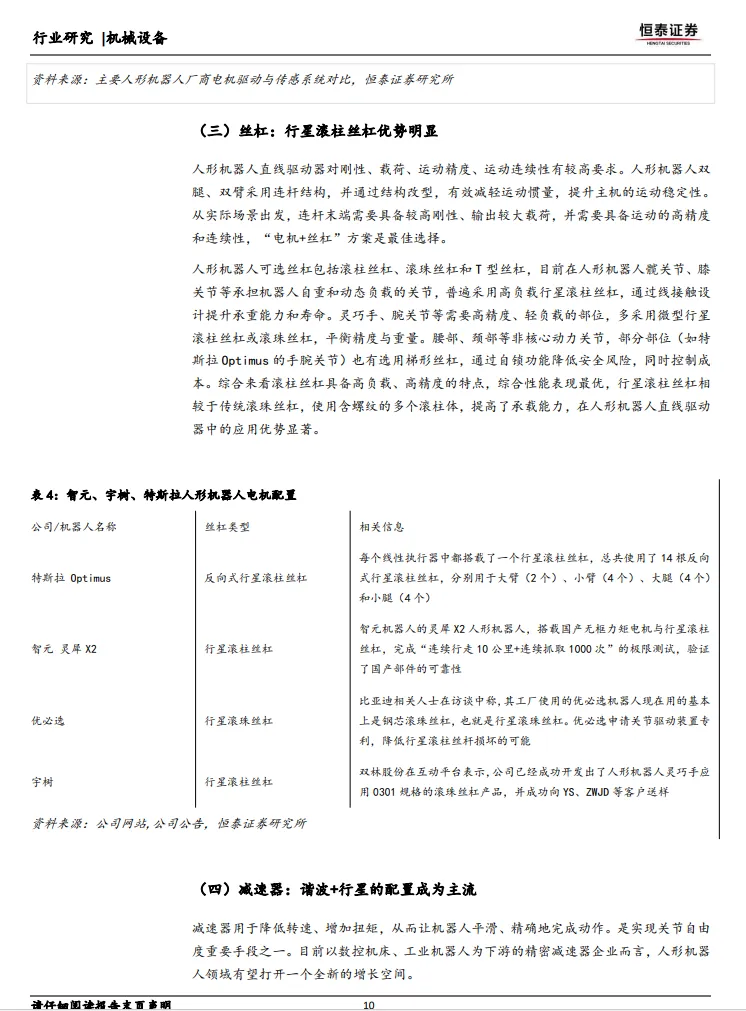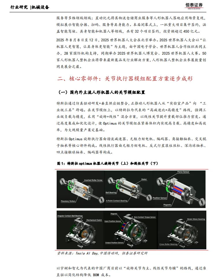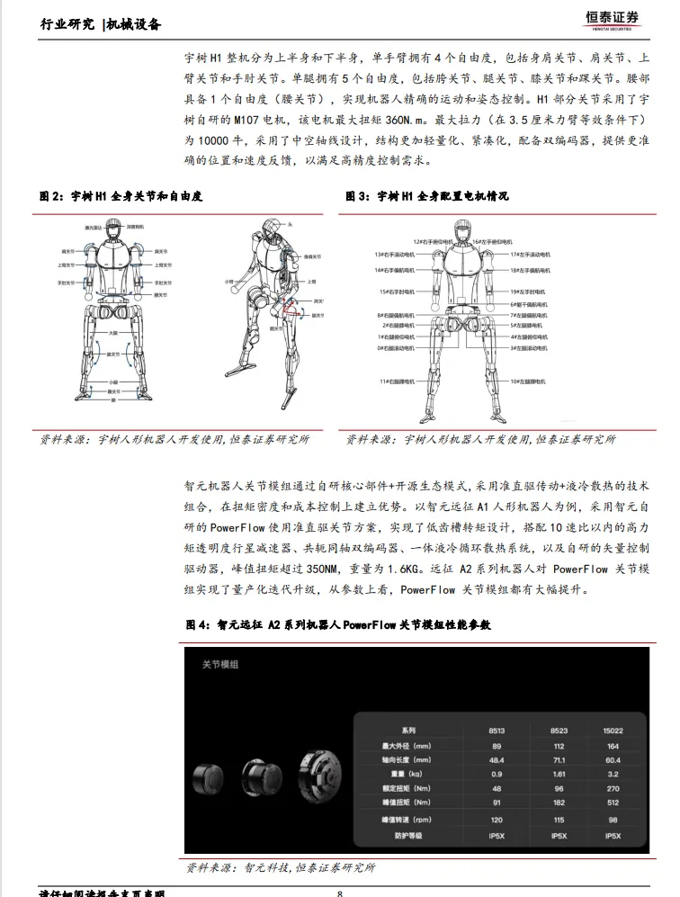 人形机器人的关节执行器模组是其核心部件之一,其配置方案直接影响机器人的性能和成本。特斯拉采用“旋转+线性”混合方案,通过线性关节提升重载部位推力密度。例如,特斯拉Optimus机器人的旋转执行器由谐波减速器、无框力矩电机、编码器等核心部件构成,线性执行器则由无框力矩电机、反式行星滚柱丝杠等构成。而以宇树和智元为代表的中国厂商则采用“旋转关节为主、线性关节为辅”的路线,通过准直驱以简化结构降低BOM成本。例如,宇树H1人形机器人采用自研的M107电机,最大扭矩360N.m,最大拉力为10000牛,配备双编码器,提供更准确的位置和速度反馈。智元机器人则通过自研核心部件+开源生态模式,采用准直驱传动+液冷散热的技术组合,实现了低齿槽转矩设计,搭配高力矩透明度行星减速器,峰值扭矩超过350N.m,重量仅为1.6kg。