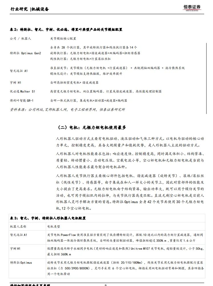 电机是人形机器人的核心动力单元,控制精度更高,具备大规模量产和能耗优势,是人形机器人主流的驱动方式。无框力矩电机由于结构紧凑,输出功率大,既可以用于模仿关节的活动,也可用于模拟肌肉的拉伸,与关节执行器高度匹配。例如,特斯拉Optimus全身42个关节共使用30个无框力矩电机和12个空心杯电机。智元机器人采用准直驱关节方案,搭配10速比以内的高力矩行星减速器,峰值扭矩超过350N.m。宇树H1采用低惯量高速内转子永磁同步电机,最大扭矩360N.m。直流无刷空心杯电机则是人形机器人灵巧手解决方案的首选,因其体积小、结构紧凑、质量轻、转动惯量小等特点,能够满足灵巧手的高精度控制需求。