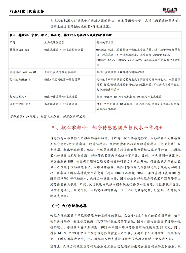 传感器是人形机器人中核心的感知部件,可以类比为人的感觉器官。人形机器人的传感器主要分为力/力矩传感器、视觉传感器、惯性测量单元和柔性触觉传感器四大类别。目前,中国企业在IMU、机器视觉领域已经具备相当科研实力和产业基础,部分企业产品在性能方面已经处于国际领先水平。然而,六维力传感器、柔性传感器等我国整体还处于发展的初级阶段,部分核心零部件依赖进口。