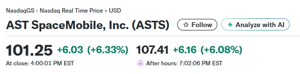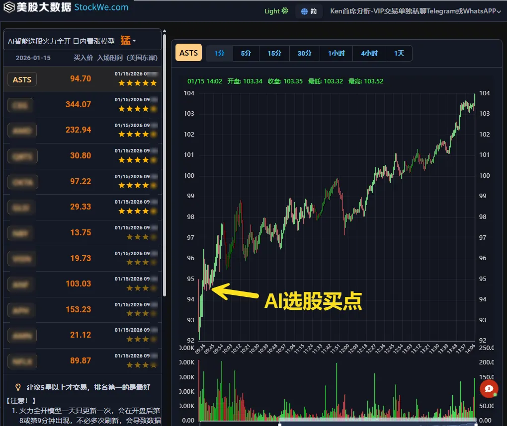 我们的美股大数据AI智能选股,今天选出了卫星通讯股ASTS。开盘仅6分钟,就在 94.7 美元发出买入信号。