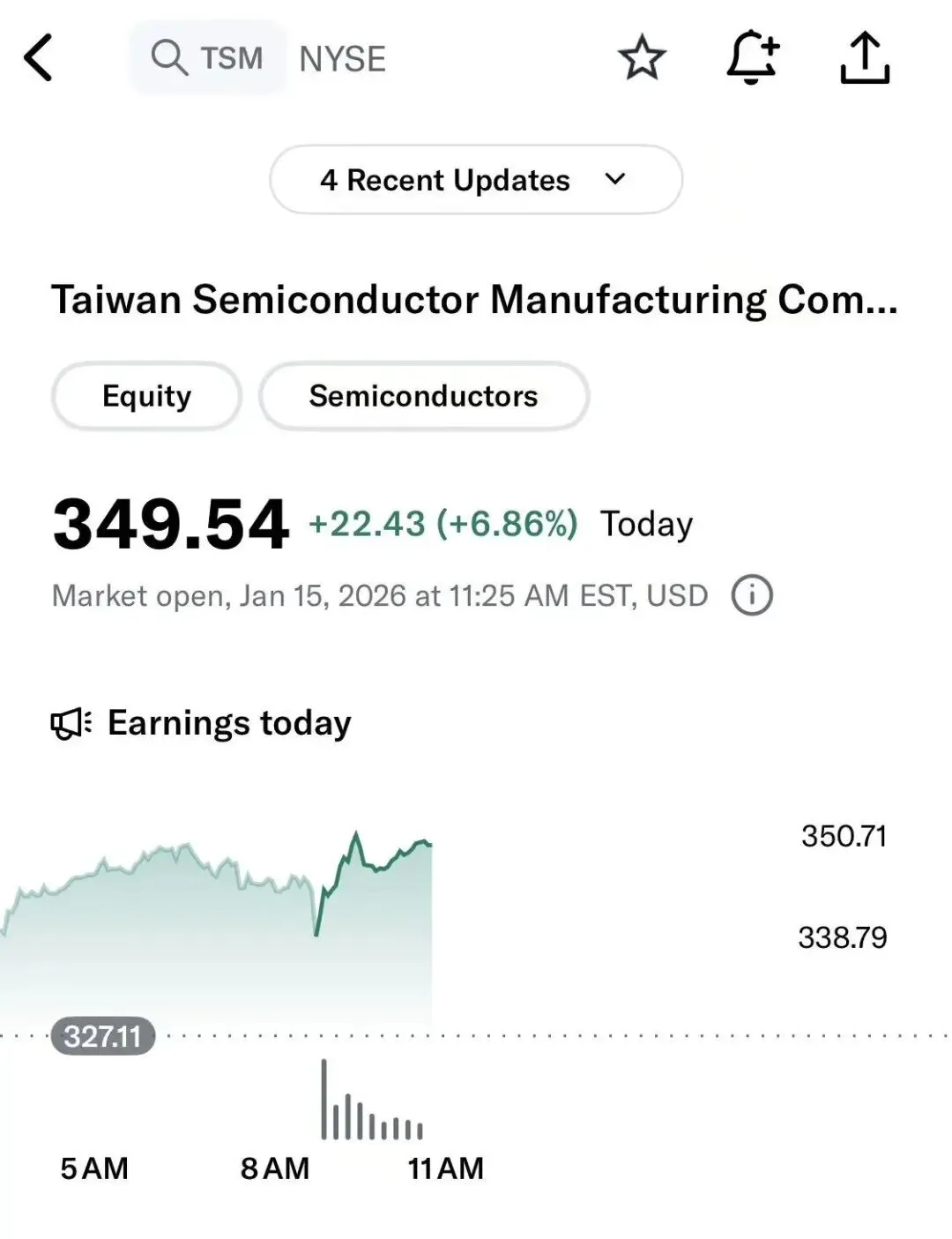 台积电财报后股价应声大涨近7%,日内高点达到 351.33美元。只比我们给出的目标价多了 1 块多。