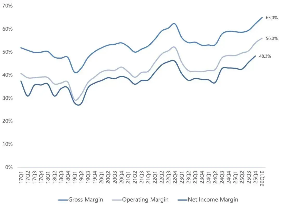 利润率的质变: Q4毛利率录得62.3%,经营利润率达到54%,双双远超市场预期。