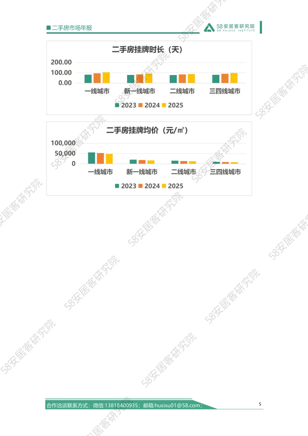 03 关键指标走势挂牌量:百城月均259.37万套(同比+14.09%),增速较2024年大幅回落,呈“年初攀升、年中回落、年末趋稳”季节性特征,三四线城市增速领跑。 找房热度:年均指数71.25(同比微跌0.01%),除2月春节低基数上涨外全年下跌,一线城市从2024年全线上涨转为2025年全线下跌,信号意义突出。 挂牌时长:整体趋稳分化显著,一线城市105天、三四线97天,前者因决策周期长,后者因需求不足,下半年同比增幅收窄,政策效应逐步显现。 挂牌均价:城市内部分化加剧,上海跌幅9.53%高于深圳7.00%,东莞跌幅14.32%远超成都3.91%,成交结构与核心资源集聚度主导抗跌差异。