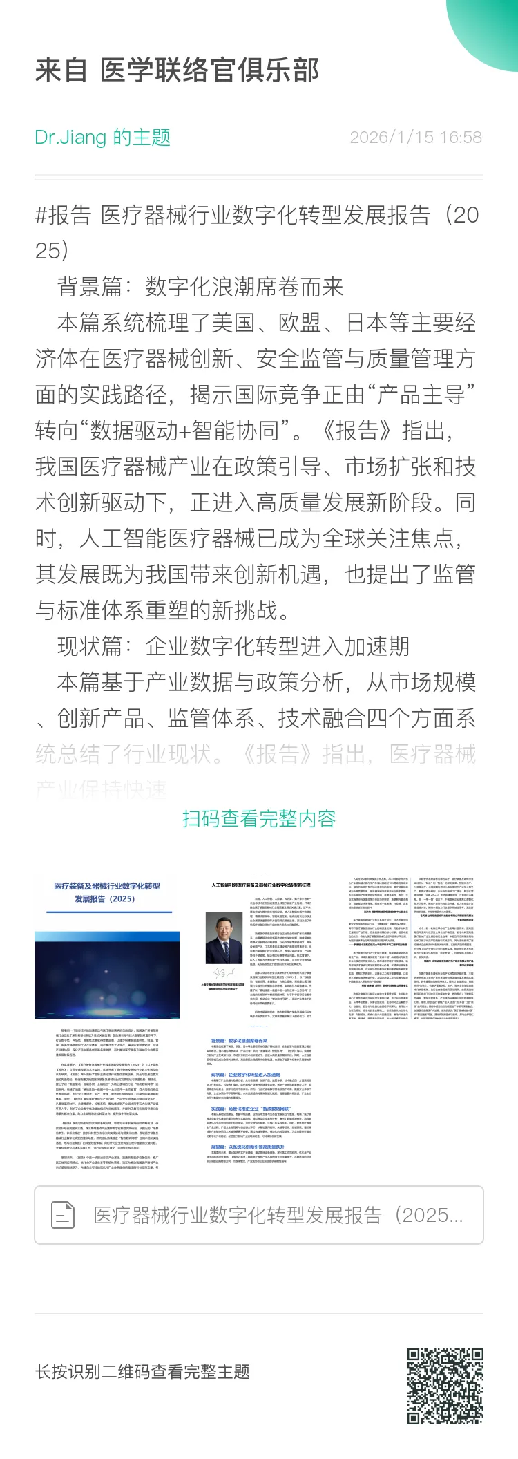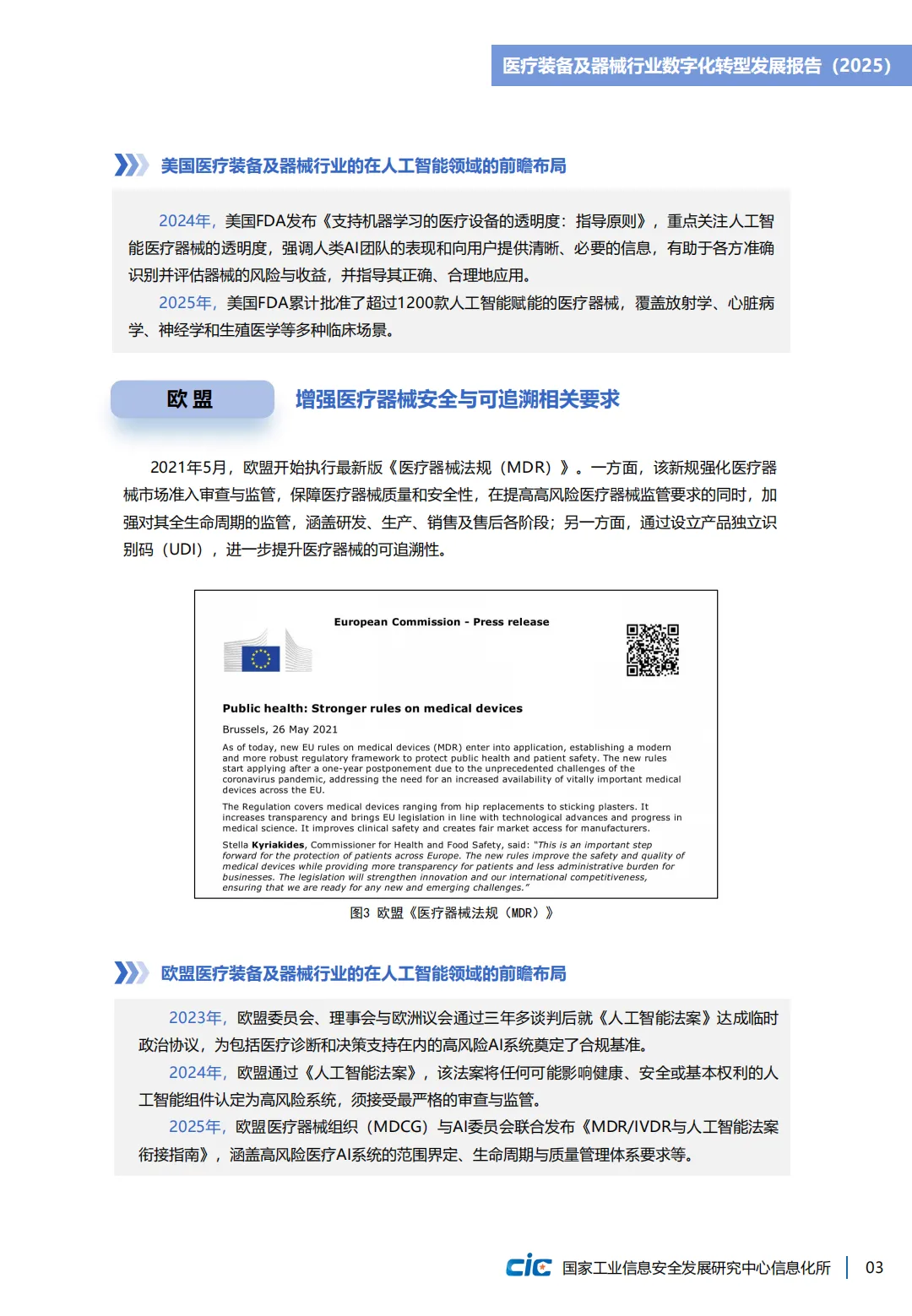 本篇系统梳理了美国、欧盟、日本等主要经济体在医疗器械创新、安全监管与质量管理方面的实践路径,揭示国际竞争正由“产品主导”转向“数据驱动+智能协同”。《报告》指出,我国医疗器械产业在政策引导、市场扩张和技术创新驱动下,正进入高质量发展新阶段。同时,人工智能医疗器械已成为全球关注焦点,其发展既为我国带来创新机遇,也提出了监管与标准体系重塑的新挑战。