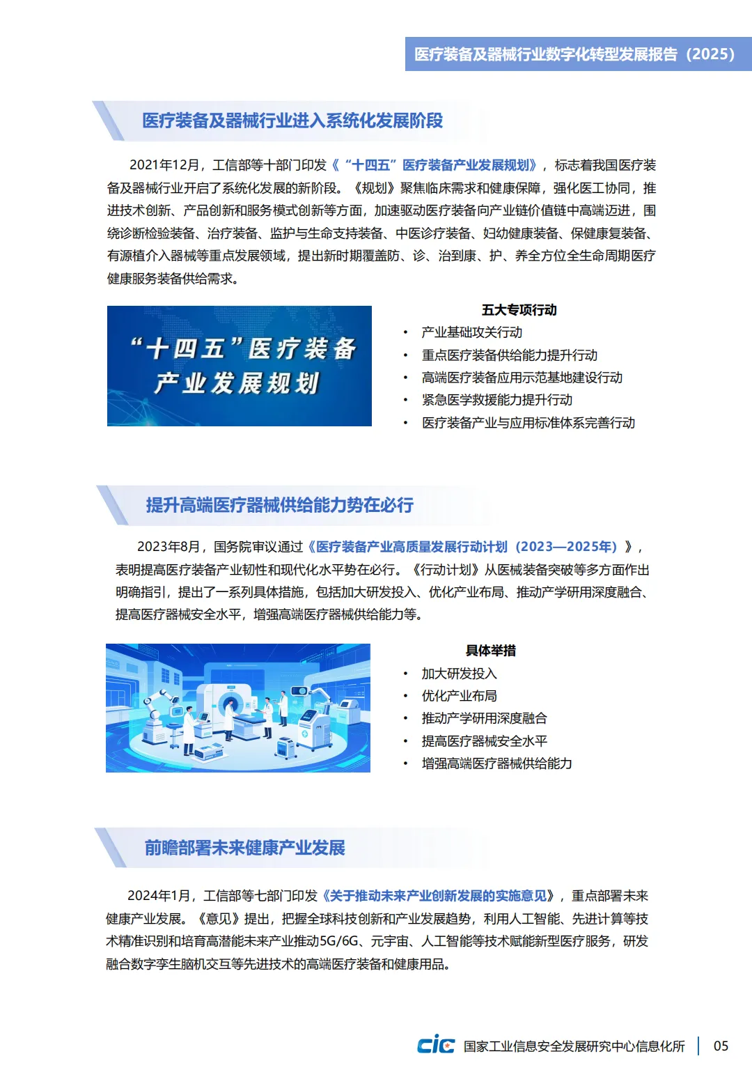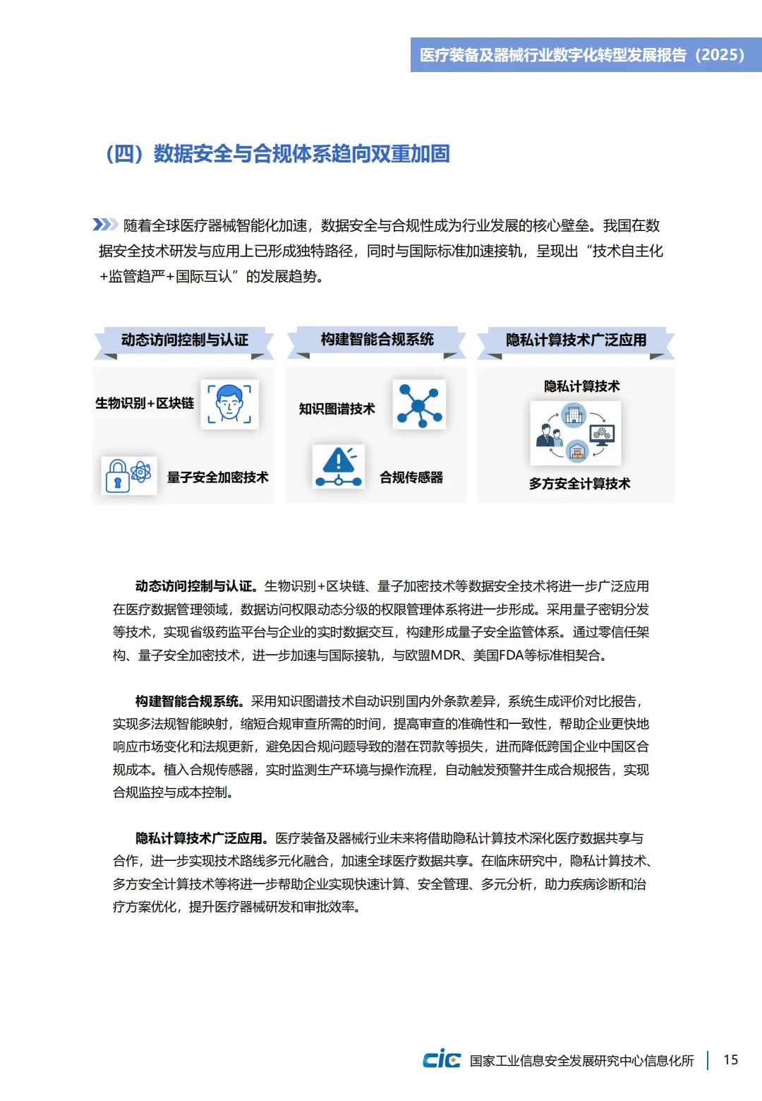 本篇基于产业数据与政策分析,从市场规模、创新产品、监管体系、技术融合四个方面系统总结了行业现状。《报告》指出,医疗器械产业保持快速增长态势,创新产品获批数量稳步上升,监管体系持续健全,数字化应用不断深化。然而,行业仍面临数字基础设施不均衡、数据安全体系不完善、企业协同水平不高等问题。未来发展趋势将聚焦智能化赋能、智慧监管体系建设、产业生态协同与数据安全治理的双重强化。