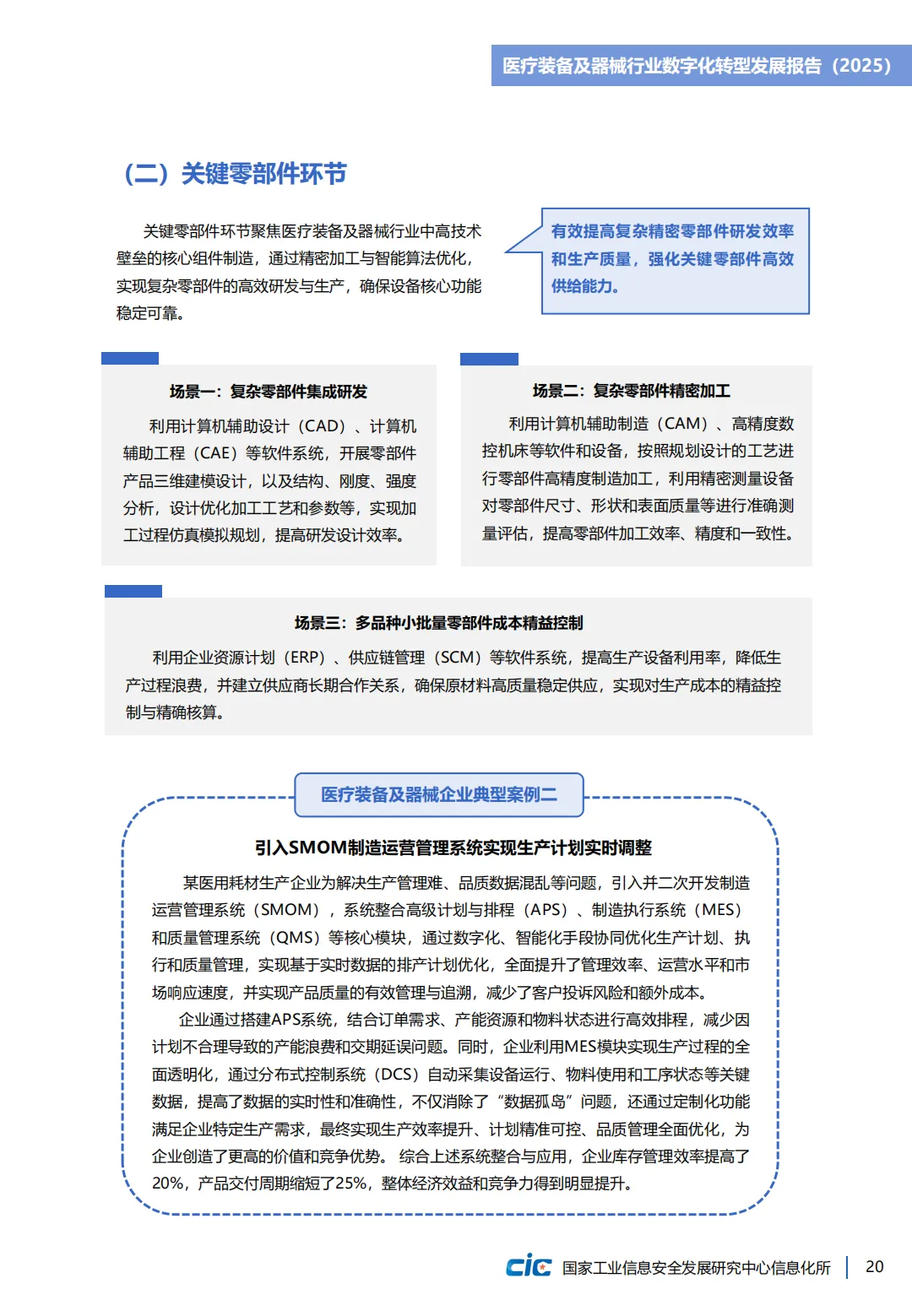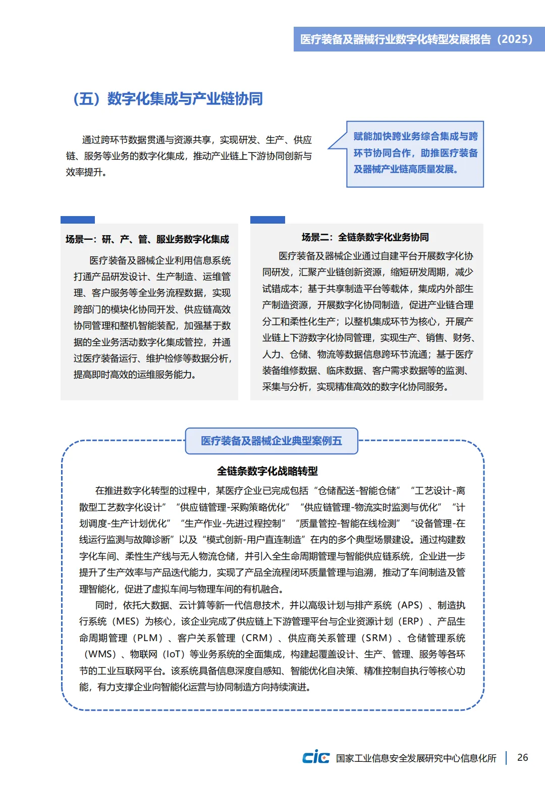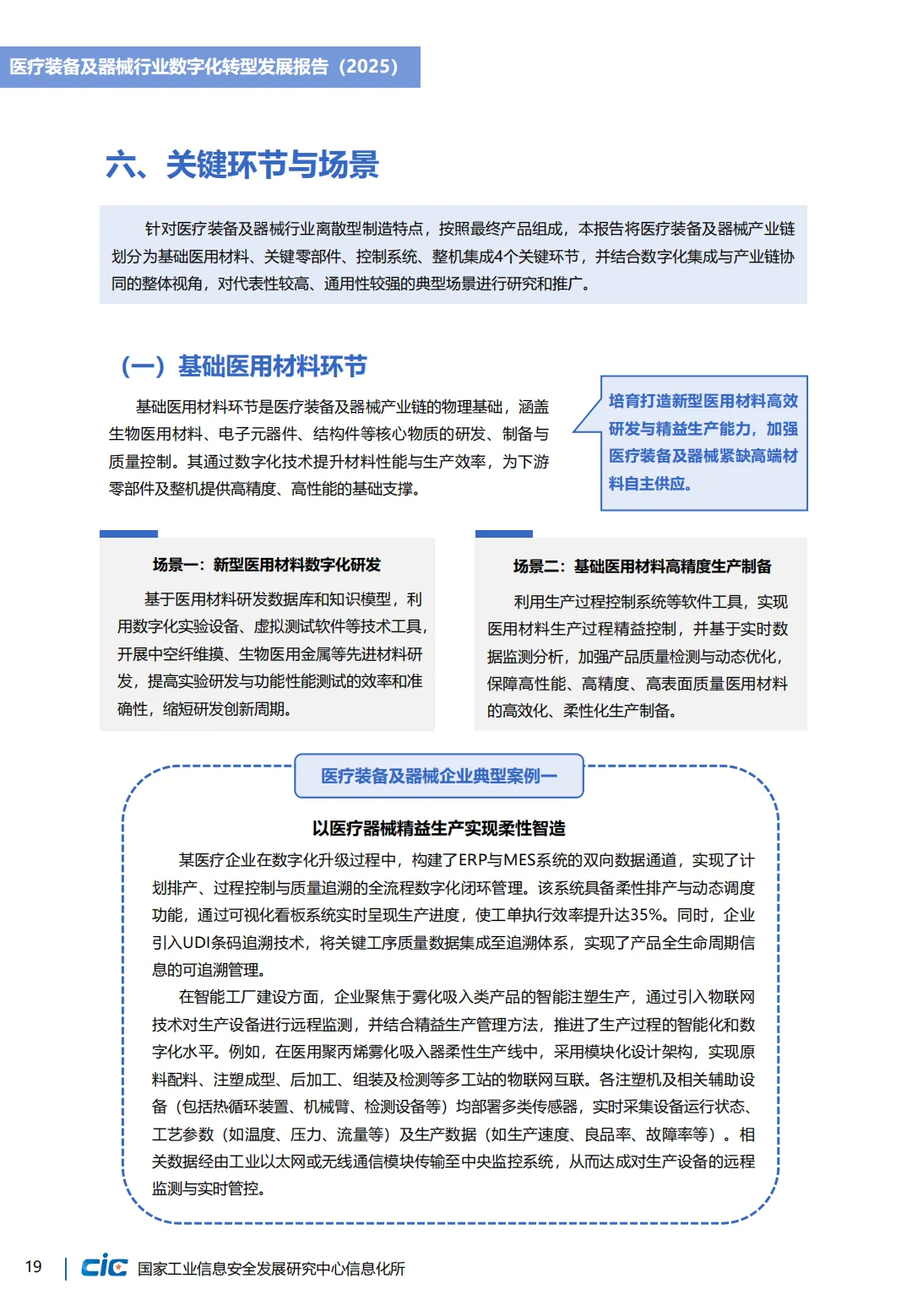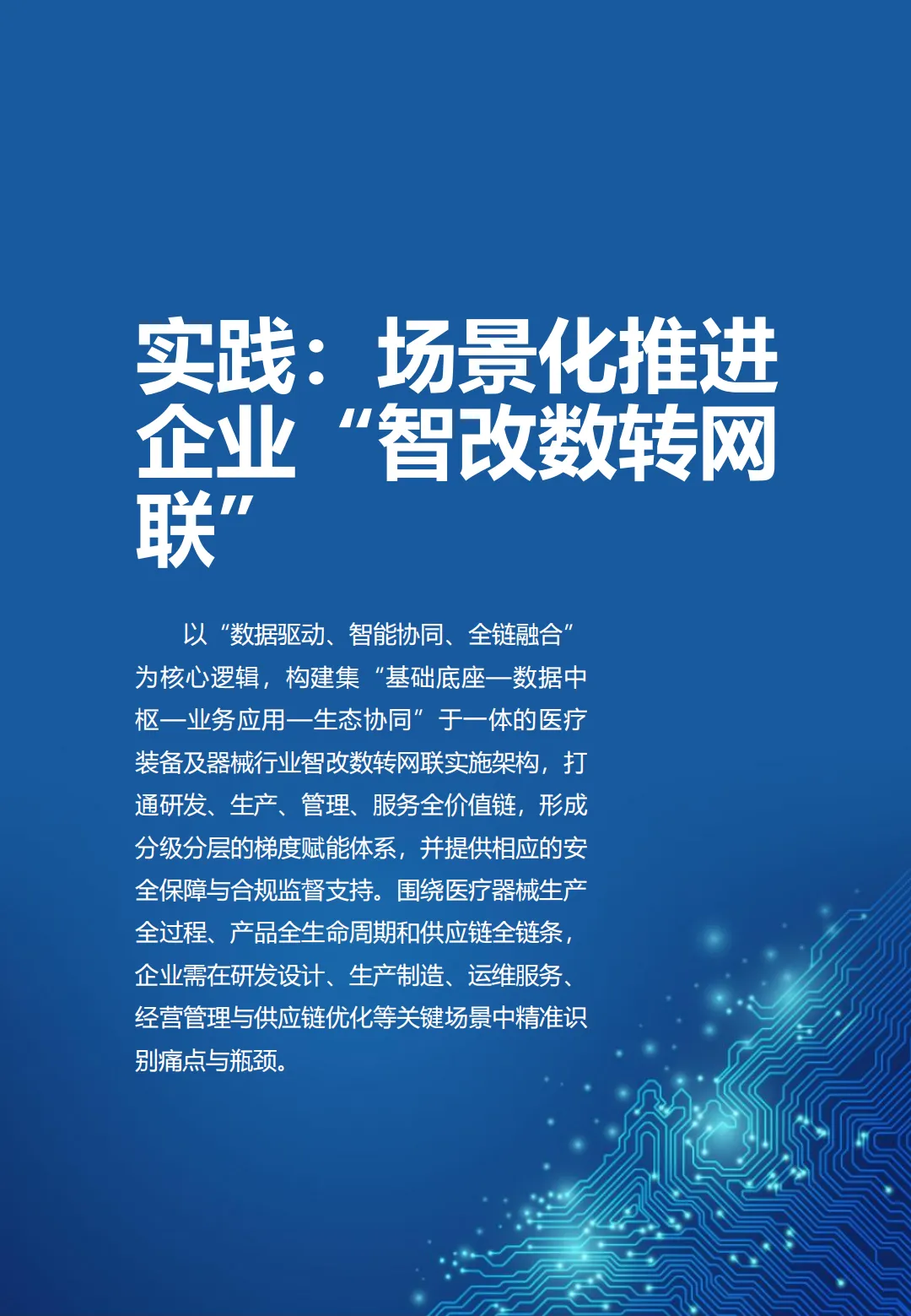 本篇从基础设施建设、数据中枢搭建、业务应用支撑与生态监管落实四个维度,明确了医疗器械企业数字化建设的重点任务与实践路径。通过典型企业案例分析,展示了数据资源整合、流程智能优化与生态协同创新的应用成效,为行业提供可复制、可推广的实践样本。同时,聚焦医疗器械生产全过程、产品全生命周期与供应链全环节,从基础医用材料、关键零部件、控制系统、整机集成到产业链协同五大关键场景展开剖析。通过构建场景化、模块化的转型框架,为企业提供可落地的数字化升级路径,促进医疗器械产业实现系统性、可持续的创新发展。
