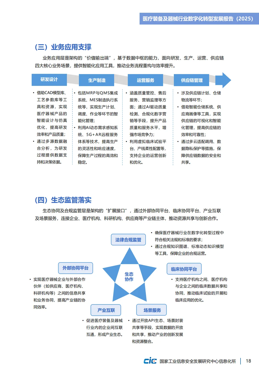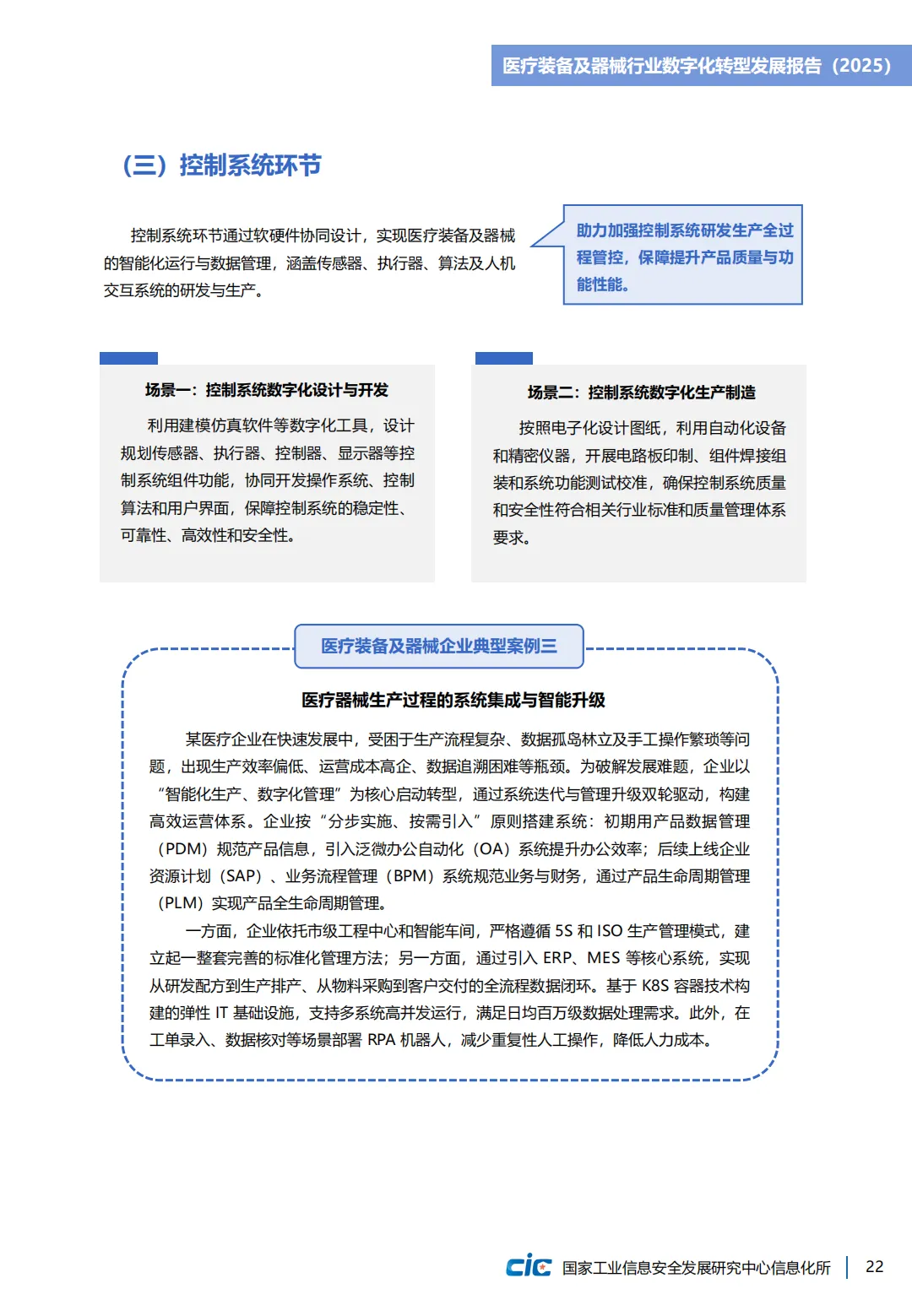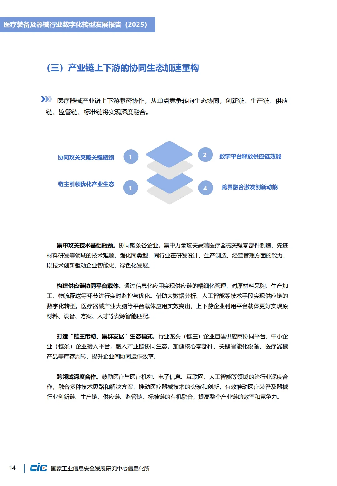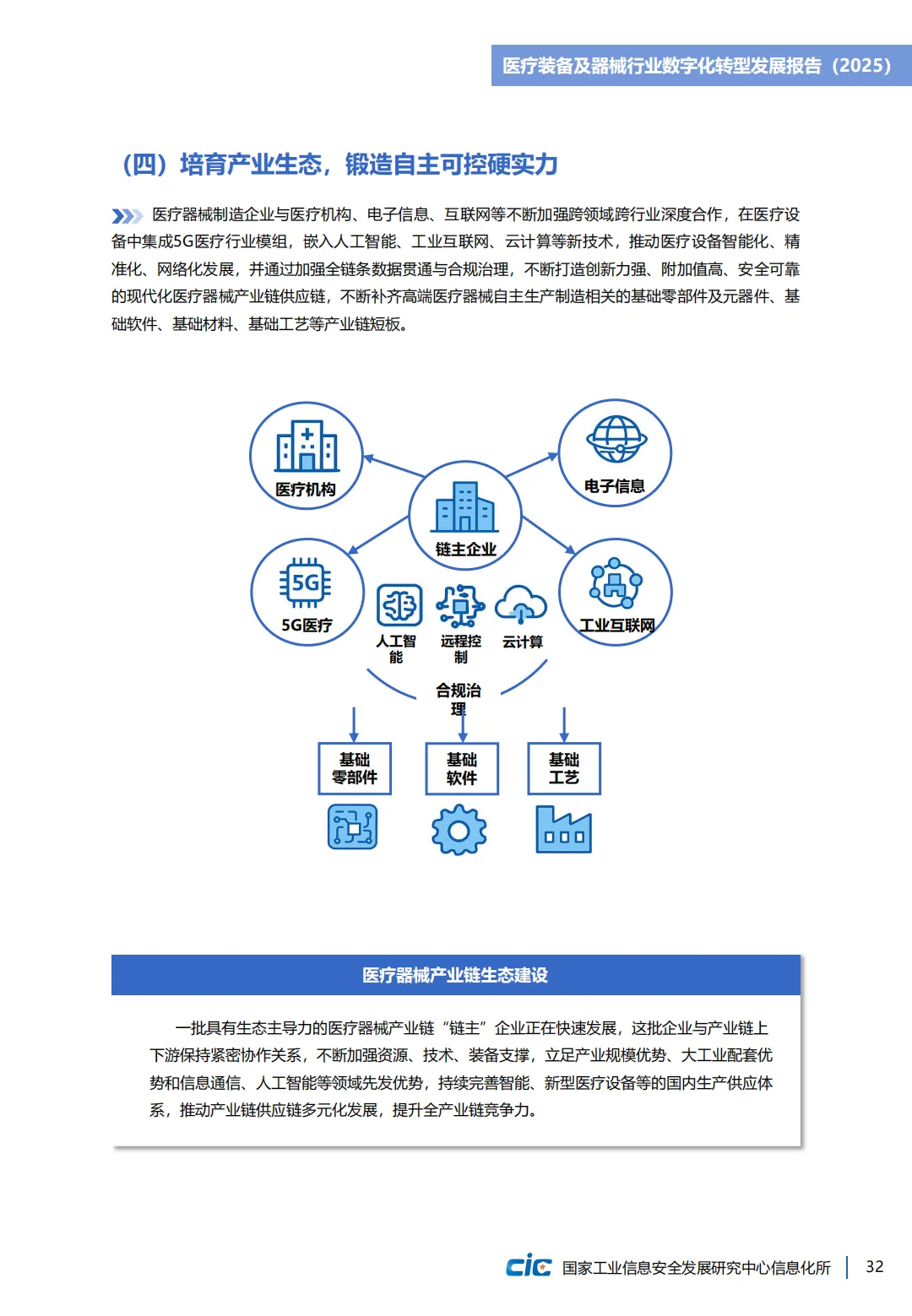 本篇从基础设施建设、数据中枢搭建、业务应用支撑与生态监管落实四个维度,明确了医疗器械企业数字化建设的重点任务与实践路径。通过典型企业案例分析,展示了数据资源整合、流程智能优化与生态协同创新的应用成效,为行业提供可复制、可推广的实践样本。同时,聚焦医疗器械生产全过程、产品全生命周期与供应链全环节,从基础医用材料、关键零部件、控制系统、整机集成到产业链协同五大关键场景展开剖析。通过构建场景化、模块化的转型框架,为企业提供可落地的数字化升级路径,促进医疗器械产业实现系统性、可持续的创新发展。