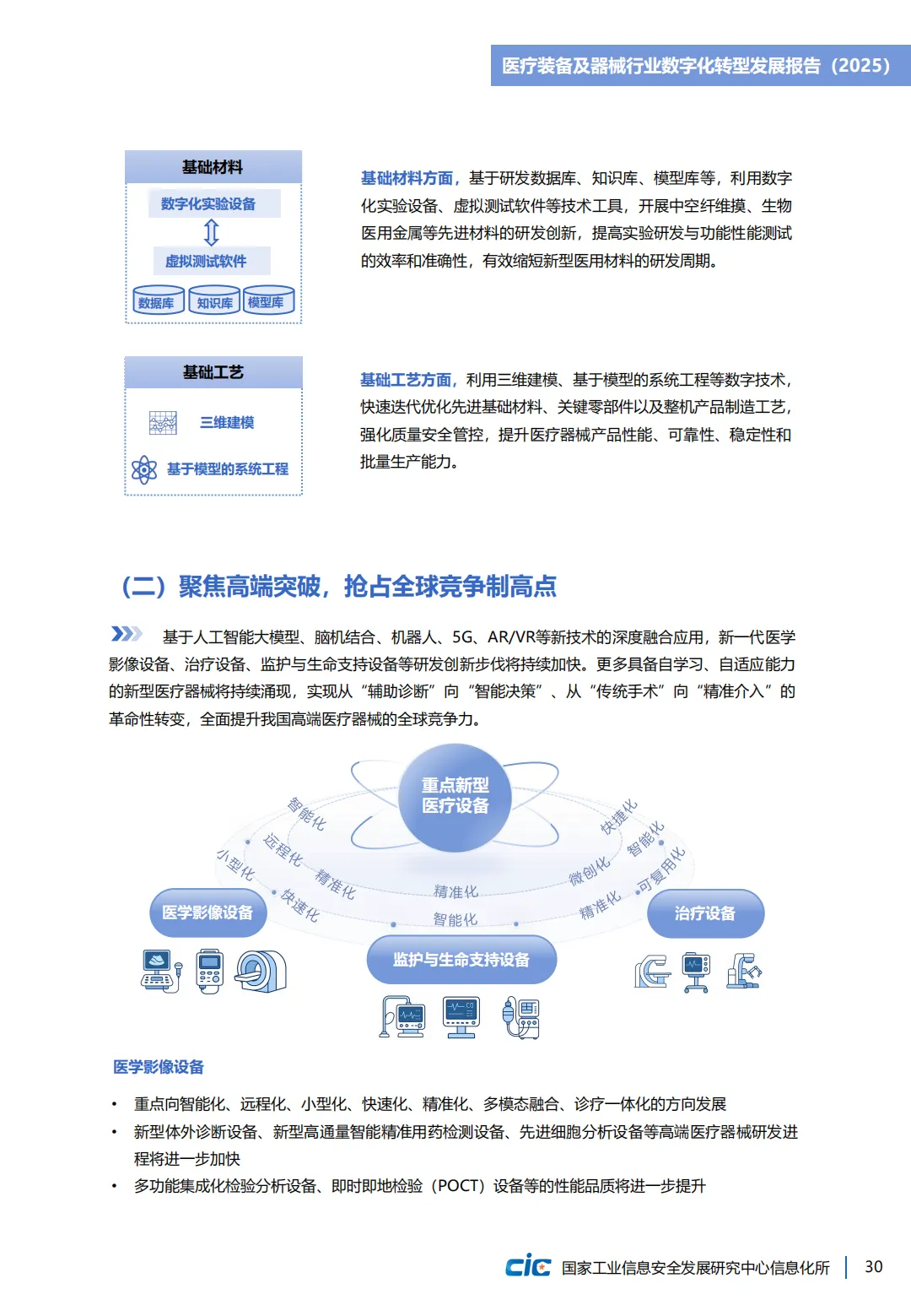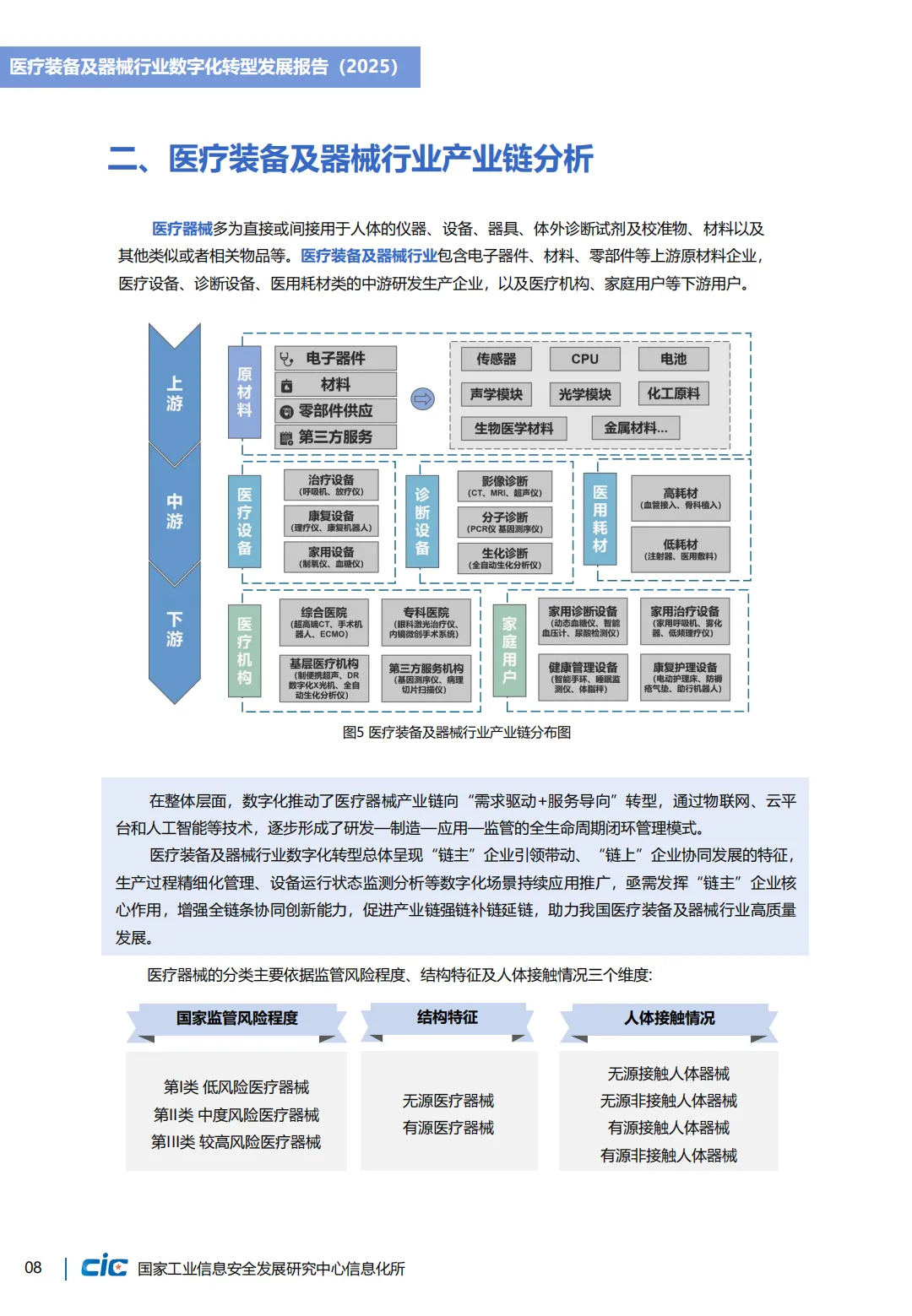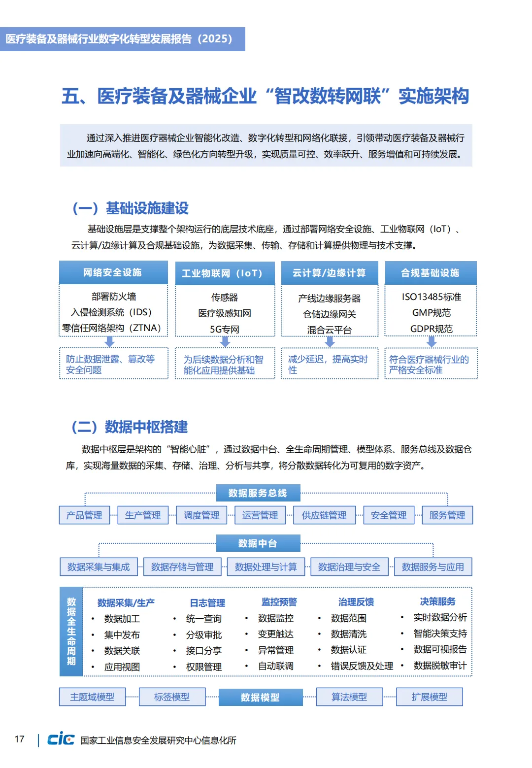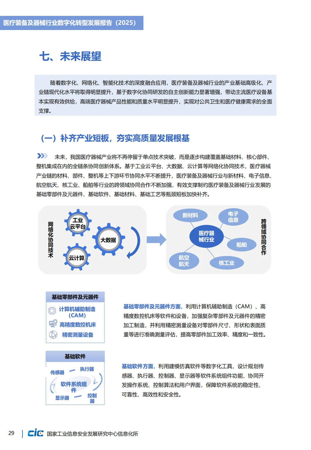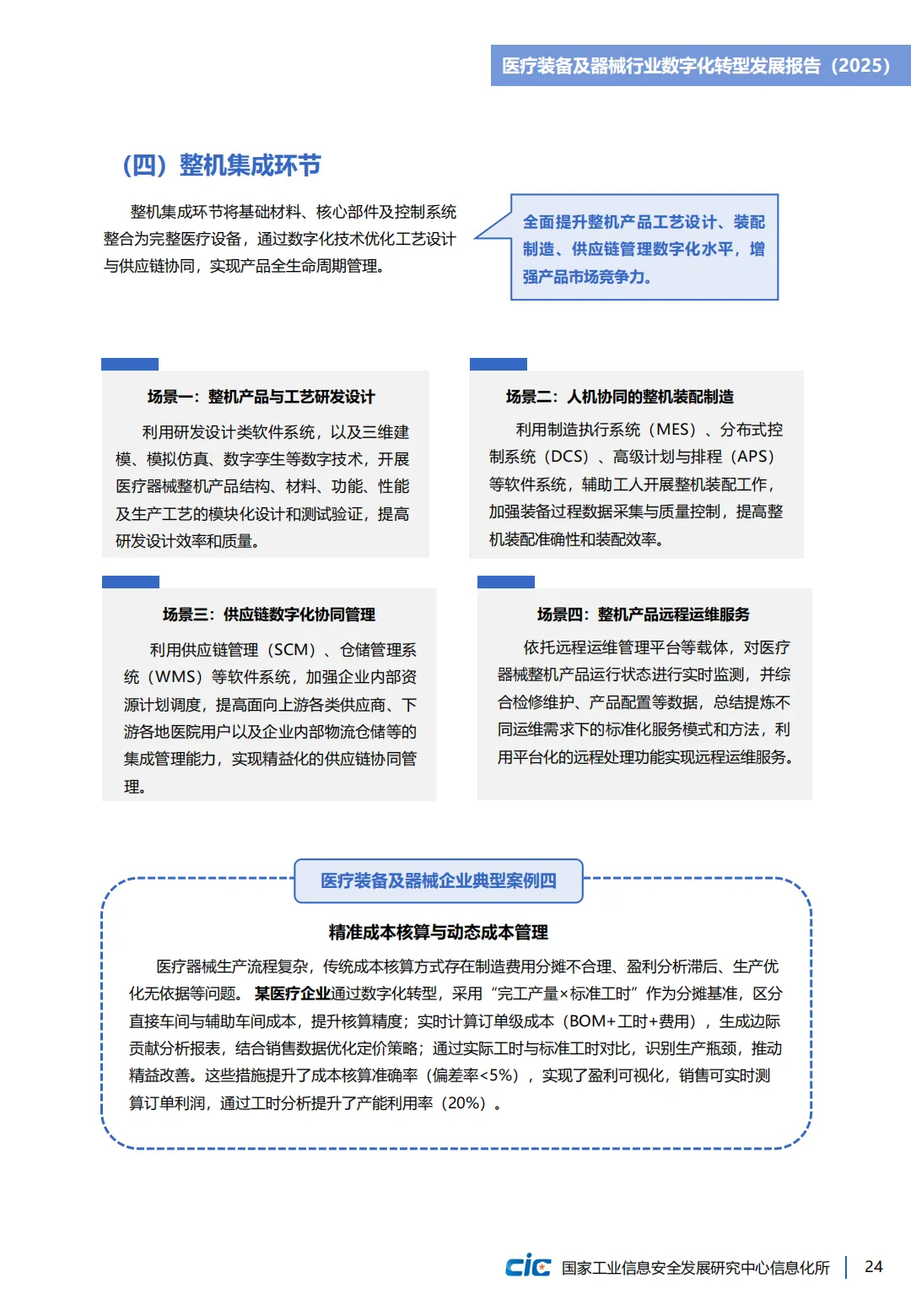 本篇从基础设施建设、数据中枢搭建、业务应用支撑与生态监管落实四个维度,明确了医疗器械企业数字化建设的重点任务与实践路径。通过典型企业案例分析,展示了数据资源整合、流程智能优化与生态协同创新的应用成效,为行业提供可复制、可推广的实践样本。同时,聚焦医疗器械生产全过程、产品全生命周期与供应链全环节,从基础医用材料、关键零部件、控制系统、整机集成到产业链协同五大关键场景展开剖析。通过构建场景化、模块化的转型框架,为企业提供可落地的数字化升级路径,促进医疗器械产业实现系统性、可持续的创新发展。