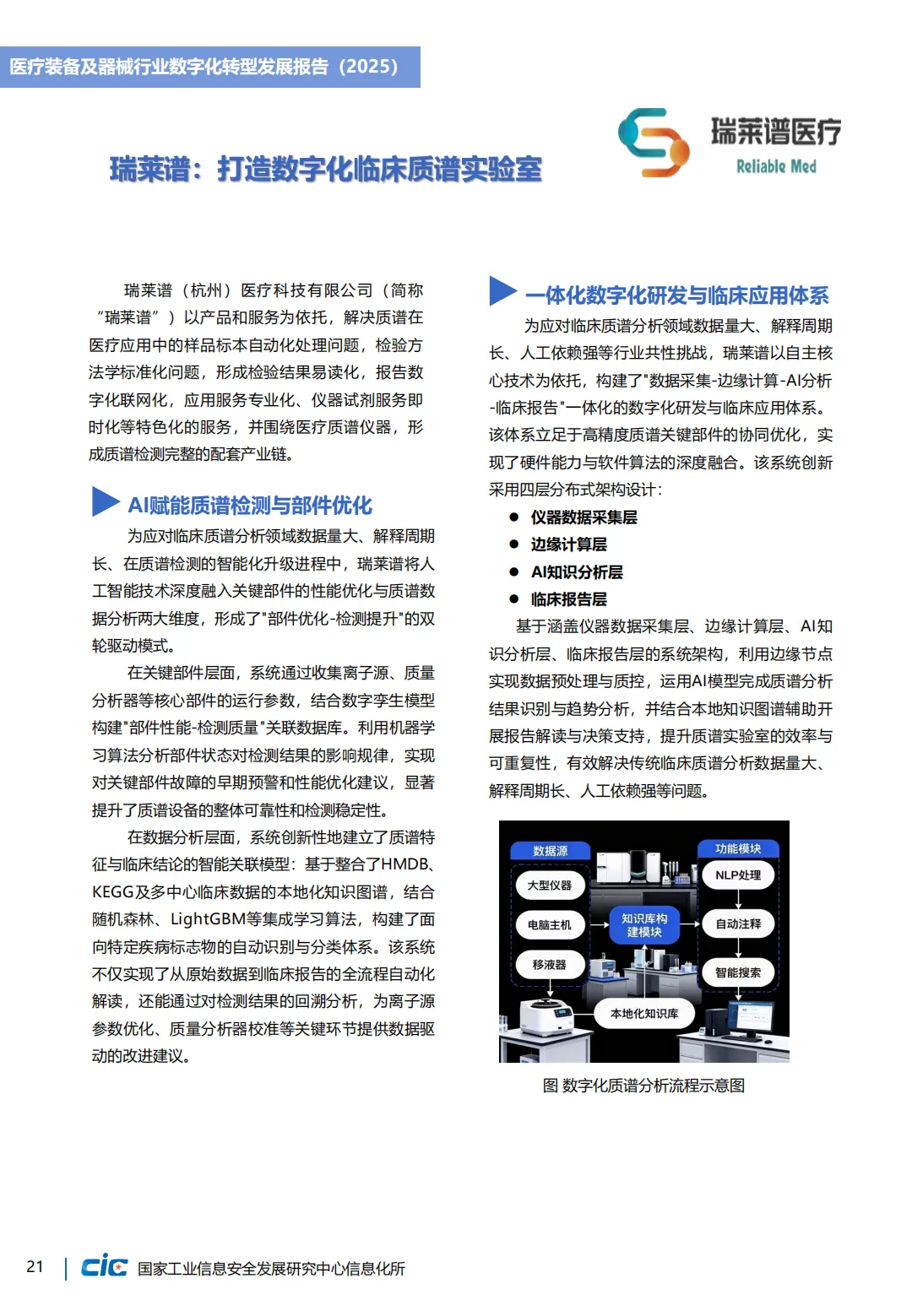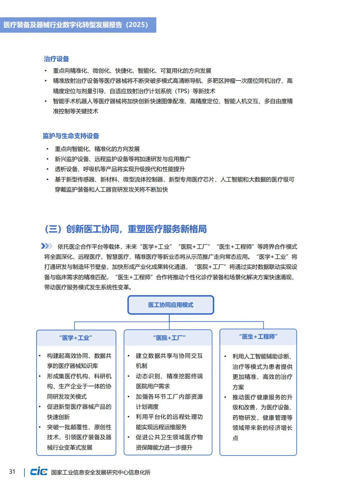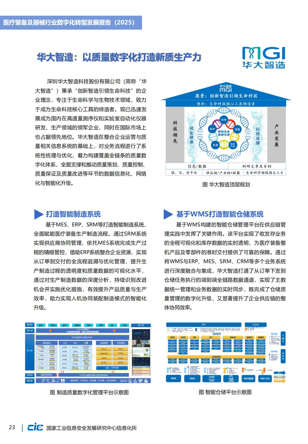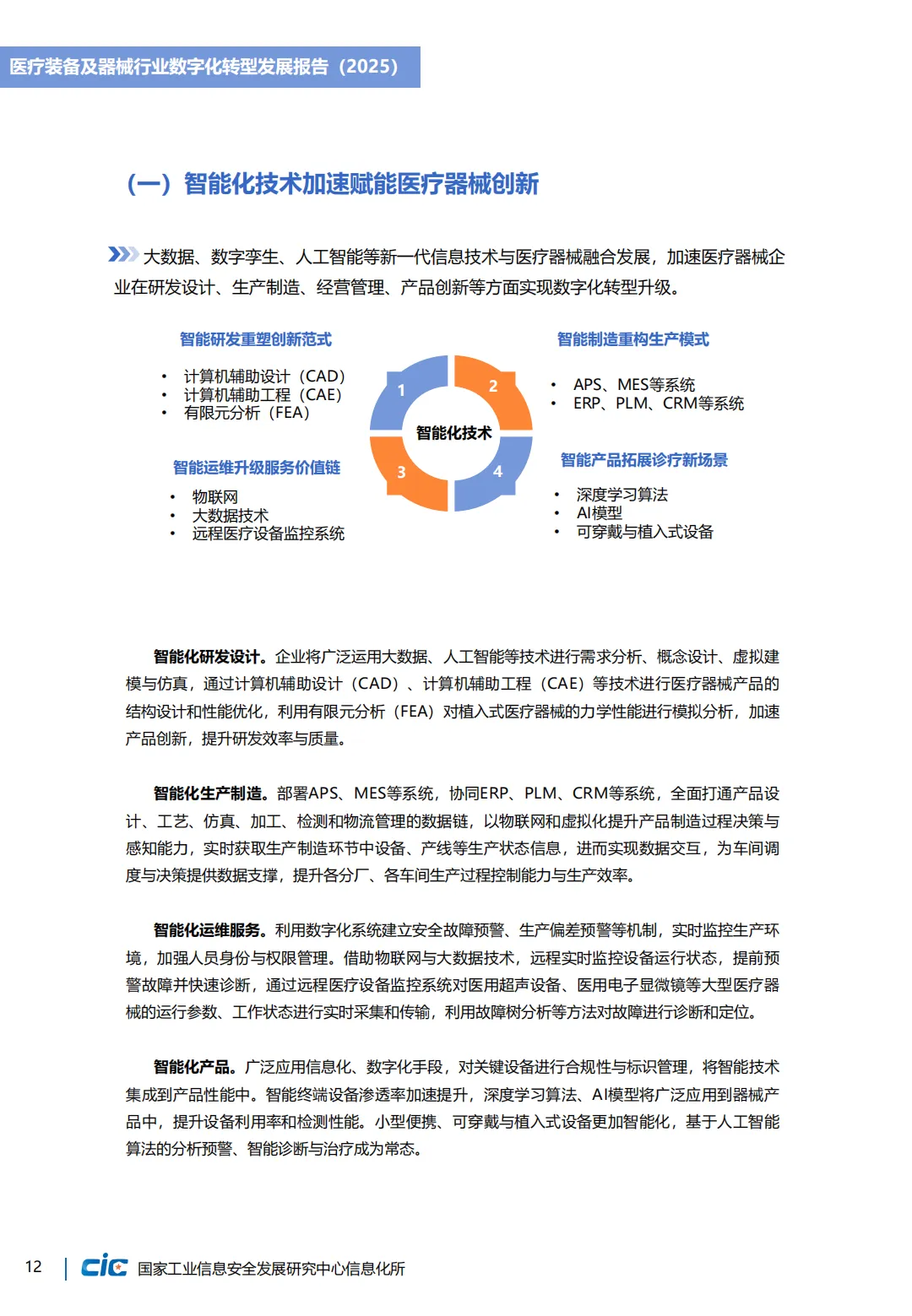 本篇从基础设施建设、数据中枢搭建、业务应用支撑与生态监管落实四个维度,明确了医疗器械企业数字化建设的重点任务与实践路径。通过典型企业案例分析,展示了数据资源整合、流程智能优化与生态协同创新的应用成效,为行业提供可复制、可推广的实践样本。同时,聚焦医疗器械生产全过程、产品全生命周期与供应链全环节,从基础医用材料、关键零部件、控制系统、整机集成到产业链协同五大关键场景展开剖析。通过构建场景化、模块化的转型框架,为企业提供可落地的数字化升级路径,促进医疗器械产业实现系统性、可持续的创新发展。