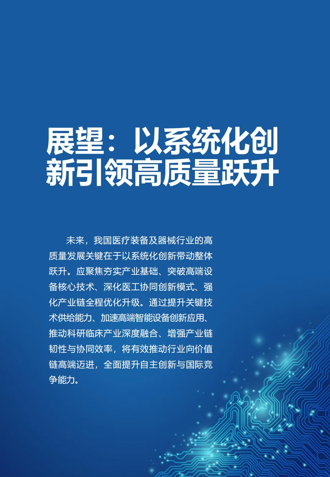 本篇面向未来,提出加快夯实产业基础、推动高端设备创新、深化医工协同应用、优化全产业链生态的系统性策略。《报告》展望了我国医疗器械产业从规模增长向质量提升、从制造导向向创新引领的战略转型方向,为政策制定、产业规划与企业实践提供前瞻性指导。
