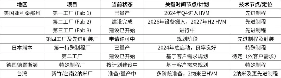 截至2026年初,台积电正处于其发展史上一个关键的扩张与技术跃迁节点。其海外建厂战略,尤其是美国亚利桑那州Gigafab集群的快速推进,是对AI引发的结构性需求的直接响应,标志着公司从集中制造向全球分布式制造模式的深刻转型。与此同时,2纳米技术家族的成功量产与快速爬坡计划,巩固了其在半导体制造领域的绝对领导地位。