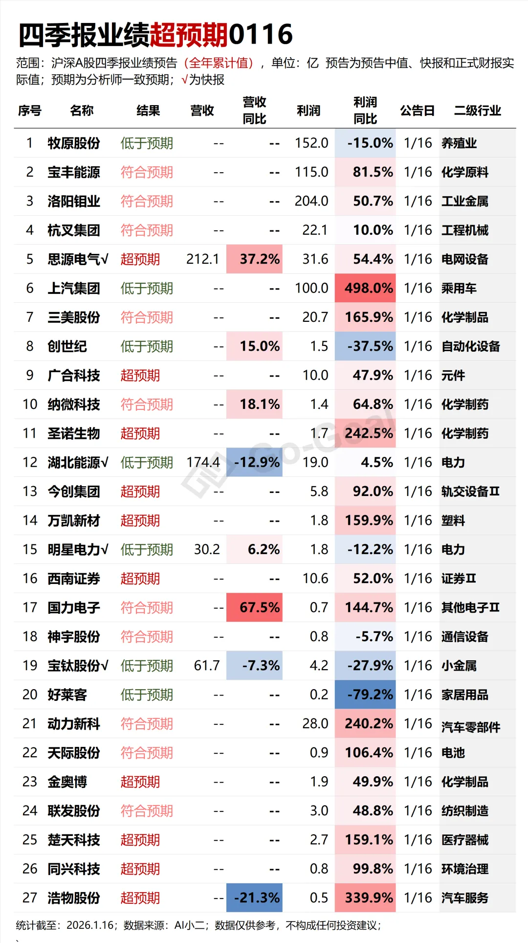 更新业绩超预期,最新洛阳钼业符合预期、思源电气、广合科技等超预期。