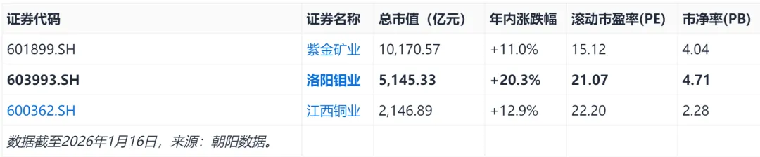 其年内涨幅(+20.3%) 显著高于紫金矿业(+11.0%)和江西铜业(+12.9%),市场表现强劲。