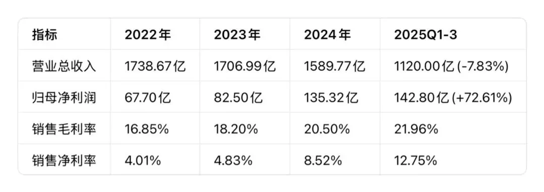 • 盈利能力持续提升:毛利率从2023年18.20%提升至2025Q1-3的21.96%,净利率提升至12.75%